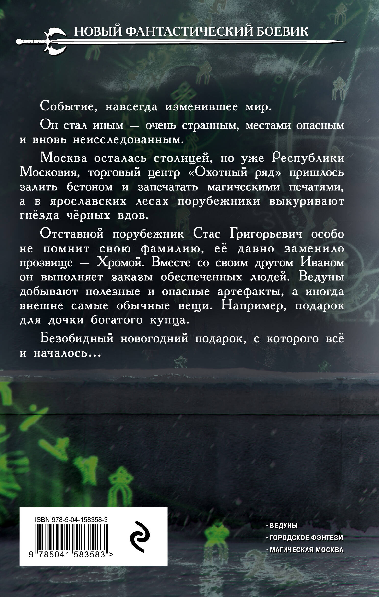 Событие, навсегда изменившее мир. Он стал иным - очень странным, местами опасным и вновь - неисследованным. Москва осталась столицей, но уже Республики Московия, торговый центр «Охотный ряд» пришлось залить бетоном и запечатать магическими печатями, а в ярославских лесах порубежники выкуривают гнёзда чёрных вдов. Отставной порубежник Стас Григорьевич особо не помнит свою фамилию, её давно заменило прозвище - Хромой. Вместе со своим другом Иваном он выполняет заказы обеспеченных людей. Ведуны добывают полезные и опасные артефакты, а иногда - внешне самые обычные вещи. Например, подарок для дочки богатого купца. Безобидный новогодний подарок, с которого всё и началось…| Издательство | ООО "Издательство "Эксмо" |
