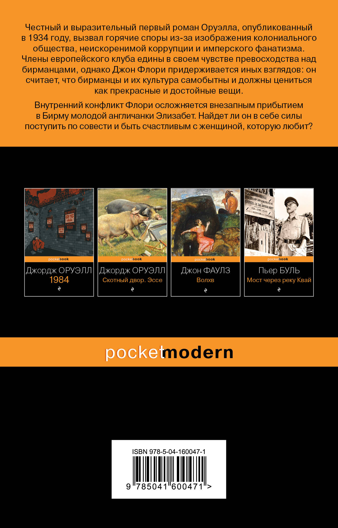Первый роман автора романа-антиутопии «1984» Джорджа Оруэлла! Основанный на его опыте работы в полиции Бирмы в 1920-е годы, «Дни в Бирме» вызвал горячие споры из-за резкого изображения колониального общества. Группа англичан, членов европейского клуба, едина в своем чувстве превосходства над бирманцами, но каждый из них предельно одинок и обильно заглушает тоску по родине чрезмерным употреблением виски. Джон Флори, лесоторговец, придерживается иных взглядов: он считает, что бирманцы и их культура самобытны и должны цениться как прекрасные и достойные вещи. Флори дополнительно подрывает веру в британское всемогущество своей дружбой с доктором Верасвами, потенциальным кандидатом на вступление в европейский клуб. А Верасвами, в свою очередь, находится под пристальным вниманием беспринципного местного судьи Ю По Кьина, ради власти готового на многое... Внутренний конфликт Флори осложняется внезапным прибытием в Бирму молодой англичанки Элизабет. Найдет ли он в себе силы поступить по совести и быть счастливым с женщиной, которую любит?| Издательство | Эксмо |