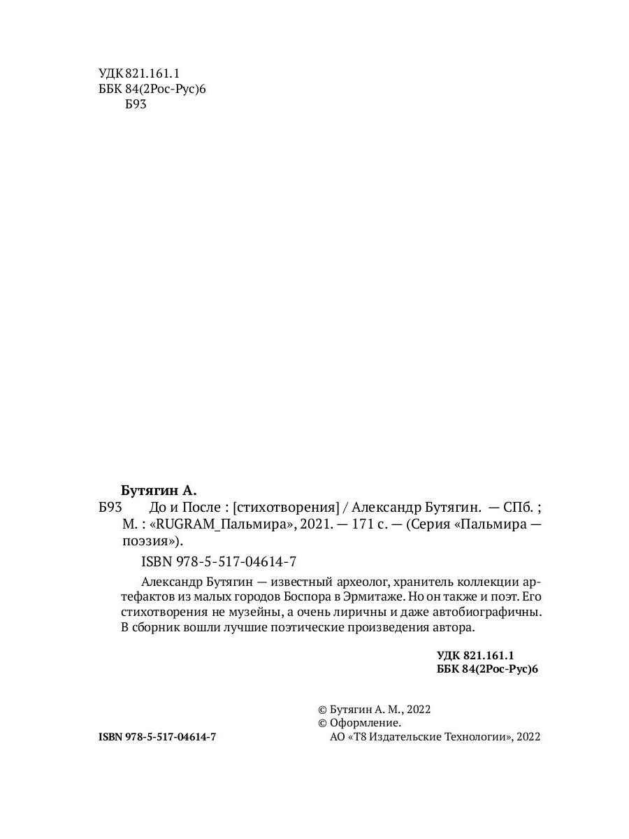 Александр Бутягин - известный археолог, хранитель коллекции артефактов из малых городов Боспора в Эрмитаже. Но он также и поэт. Его стихотворения не музейны, а очень лиричны и даже автобиографичны. В сборник вошли лучшие поэтические произведения автора.| Издательство | Т8 RUGRAM |
