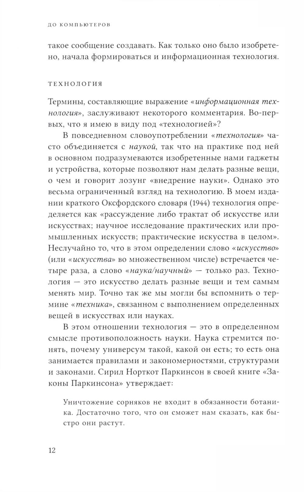 Мысль о том, что цифровая эра коренным образом изменила наше повседневное восприятие мира, не нова и хорошо знакома историкам культуры. Однако Стивен Робертсон в книге «До компьютеров...» бросает вызов идее о том, что середина XX века стала единственным переломным моментом в этом процессе. Он исследует все знания, изобретения и концепции - все способы эволюции нашего мышления, - которые предшествовали информационнотехнологической революции второй половины XX века, прослеживая путь от истоков обработки данных до самых ранних форм человеческих технологий, таких как развитие письменности, и объединяя в одно нелинейное повествование целую историю революционных моментов в развитии информационных технологий. Книга предлагает глубокий и разносторонний взгляд на историю технологий, не требуя от читателя специальных знаний. Благодаря четкой структуре и увлекательному стилю изложения она будет интересна как для специалистов, так и для широкой читательской аудитории.| Издательство | ИД Высшей школы экономики |