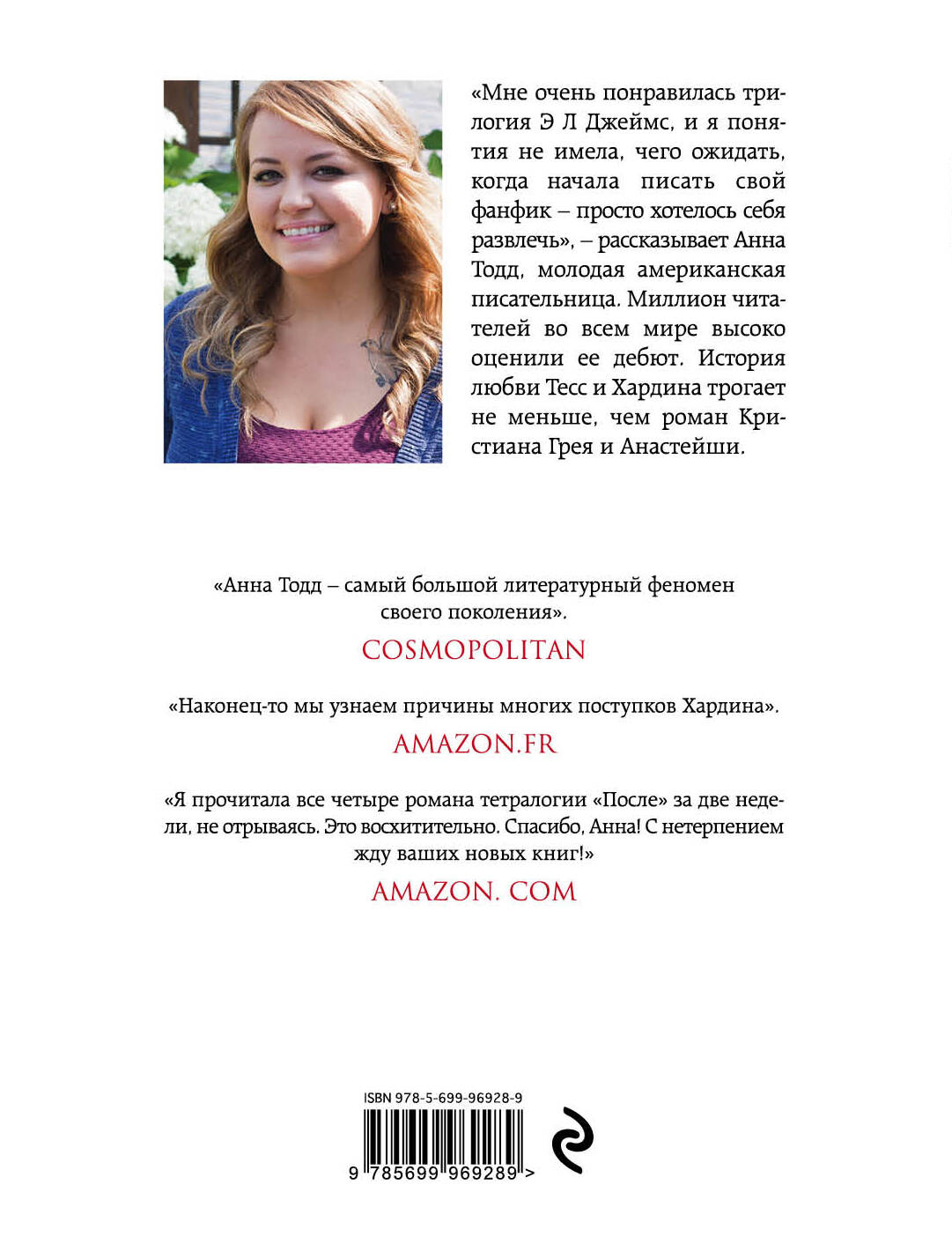 Более миллиона поклонников Э Л Джеймс уже прочитали эту книгу. Романы «После» американской писательницы Анны Тодд прогремели по миру чередой ярких салютов. Культовая история любви между Тессой и Хардином, которая смогла очаровать сотни тысяч читателей, теперь предстанет перед вами в совсем ином виде... С романом Анны Тодд «До того как» вы сможете снова погрузиться в эту чарующую историю примерной девочки и плохого парня и увидеть, теперь глазами Хардина, тот путь, который прошла их любовь. Теперь вы узнаете, что же происходило в его голове... Анна Тодд - самый большой литературный феномен своего поколения. Cosmopolitan Наконец-то мы узнаем причины многих поступков Хардина. Amazon.fr Я прочитала все четыре романа тетралогии «После» за две недели, не отрываясь. Это восхитительно Спасибо, Анна! С нетерпением жду ваших новых книг! Amazon. com| Издательство | ООО "Издательство "Эксмо" |