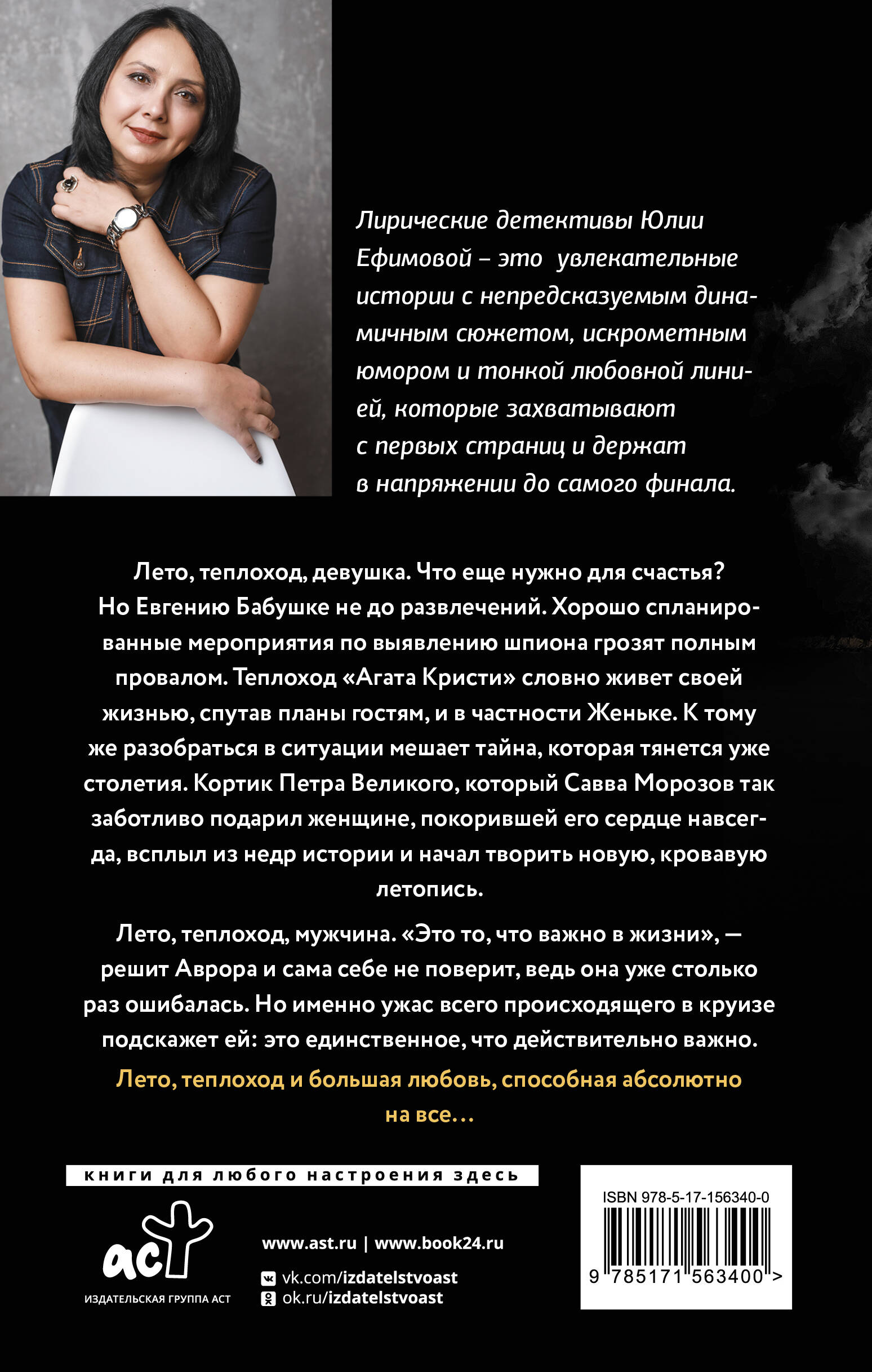 Лето, теплоход, девушка. Что еще нужно для счастья? Но Евгению Бабушке не до развлечений. Хорошо спланированные мероприятия по выявлению шпиона грозят полным провалом. Теплоход "Агата Кристи" словно живет своей жизнью, спутав планы гостям и, в частности Женьке. К тому же разобраться в ситуации мешает тайна, которая тянется уже столетия. Кортик Петра Великого, который Савва Морозов так заботливо подарил женщине, покорившей его сердце навсегда, всплыл из недр истории и начал творить новую, кровавую летопись. Лето, теплоход, мужчина. "Это то, что важно в жизни", - решит Аврора и сама себе не поверит, ведь она уже столько раз ошибалась. Но именно ужас всего происходящего в круизе подскажет ей: это единственное, что действительно важно. Лето, теплоход и большая любовь, способная абсолютно на все...
