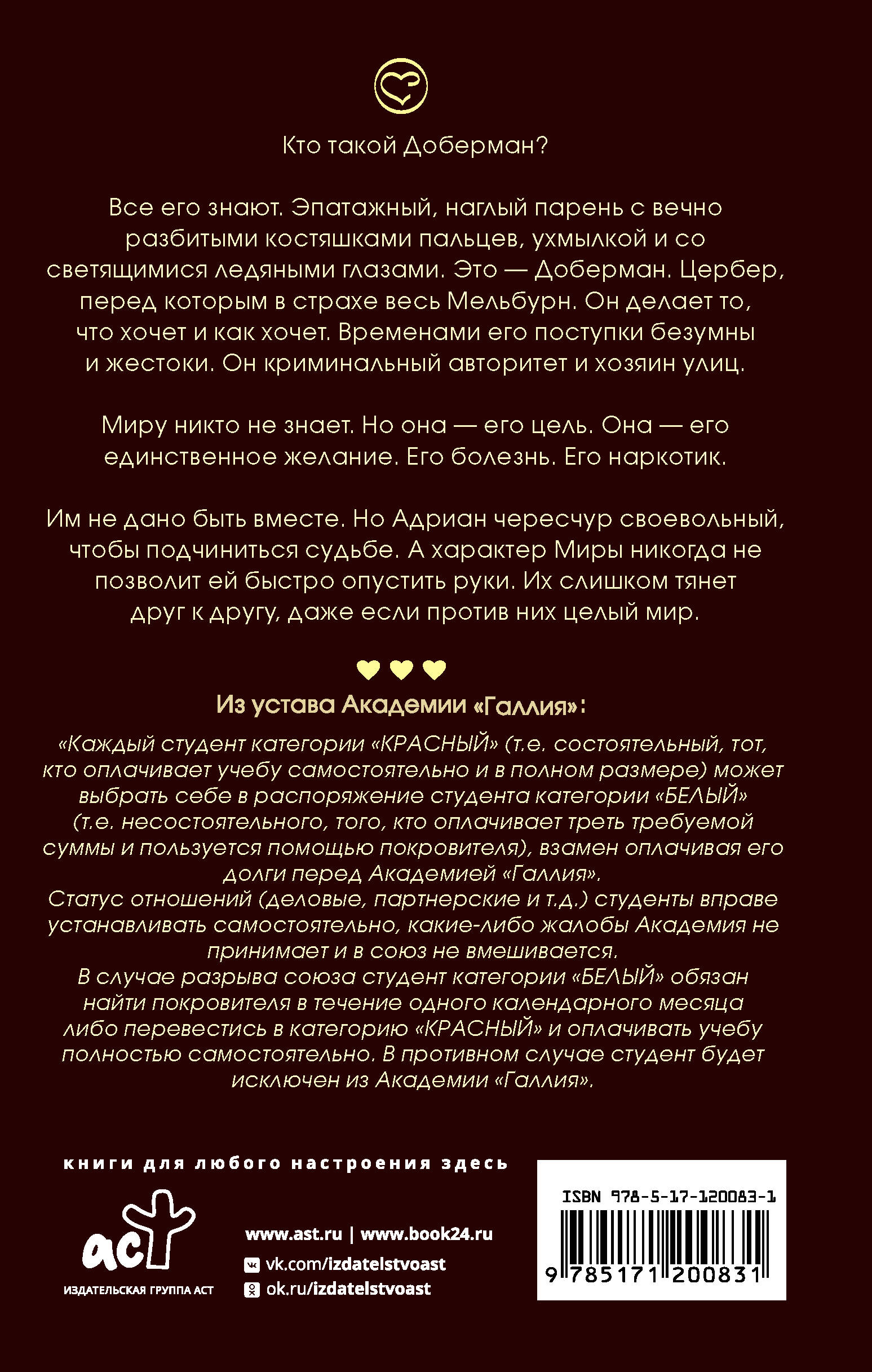 Один студент академии платит за обучение другого, но чем нужно платить в ответ, если у тебя совсем нет денег? Книги о школах и университетах и разворачивающихся в них любовных драмах - один из любимых сюжетов молодежных книг и фильмов. Романы Эль Кеннеди, Моны Кастен и др. наглядным примером показывают, что такие истории всегда привлекают внимание. Эмоциональные качели и калейдоскоп эмоций обеспечены. Дебютный роман Эль Реми уже покорил сердца тысяч читательниц, ведь каждая из них тайком мечтает о своем Добермане.| Издательство | ИЗДАТЕЛЬСТВО "АСТ" |