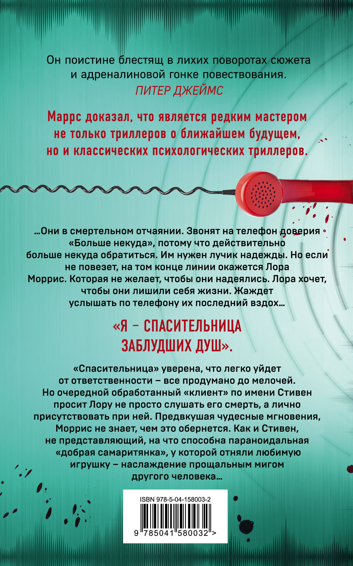 От автора бестселлеров «THE ONE. ЕДИНСТВЕННЫЙ» и «ПАССАЖИРЫ». Этот приятный женский голос из телефона… Так звучит смерть. Маррс доказал, что является редким мастером не только триллеров о ближайшем будущем, но и классических психологических триллеров. …Они в смертельном отчаянии. Звонят на телефон доверия «Больше некуда», потому что действительно больше некуда обратиться. Им нужен лучик надежды. Но если не повезет, на том конце линии окажется Лора Моррис. Которая не желает, чтобы они надеялись. Лора хочет, чтобы они лишили себя жизни. Жаждет услышать по телефону их последний вздох… «Я - спасительница заблудших душ». «Спасительница» уверена, что легко уйдет от ответственности - все продумано до мелочей. Но очередной обработанный «клиент» по имени Стивен просит Лору не просто слушать его смерть, а лично присутствовать при ней. Предвкушая чудесные мгновения, Моррис не знает, чем это обернется. Как и Стивен, не представляющий, на что способна параноидальная «добрая самаритянка», у которой отняли любимую игрушку - наслаждение прощальным мигом другого человека… -------------------------------------------------- «Мрачно и захватывающе, заставляет о многом задуматься». - The Sun «Маррс поистине блестящ в лихих поворотах сюжета и адреналиновой гонке повествования». - Питер Джеймс «Шок на каждой следующей странице». - Wall Street Journal| Издательство | ООО "Издательство "Эксмо" |