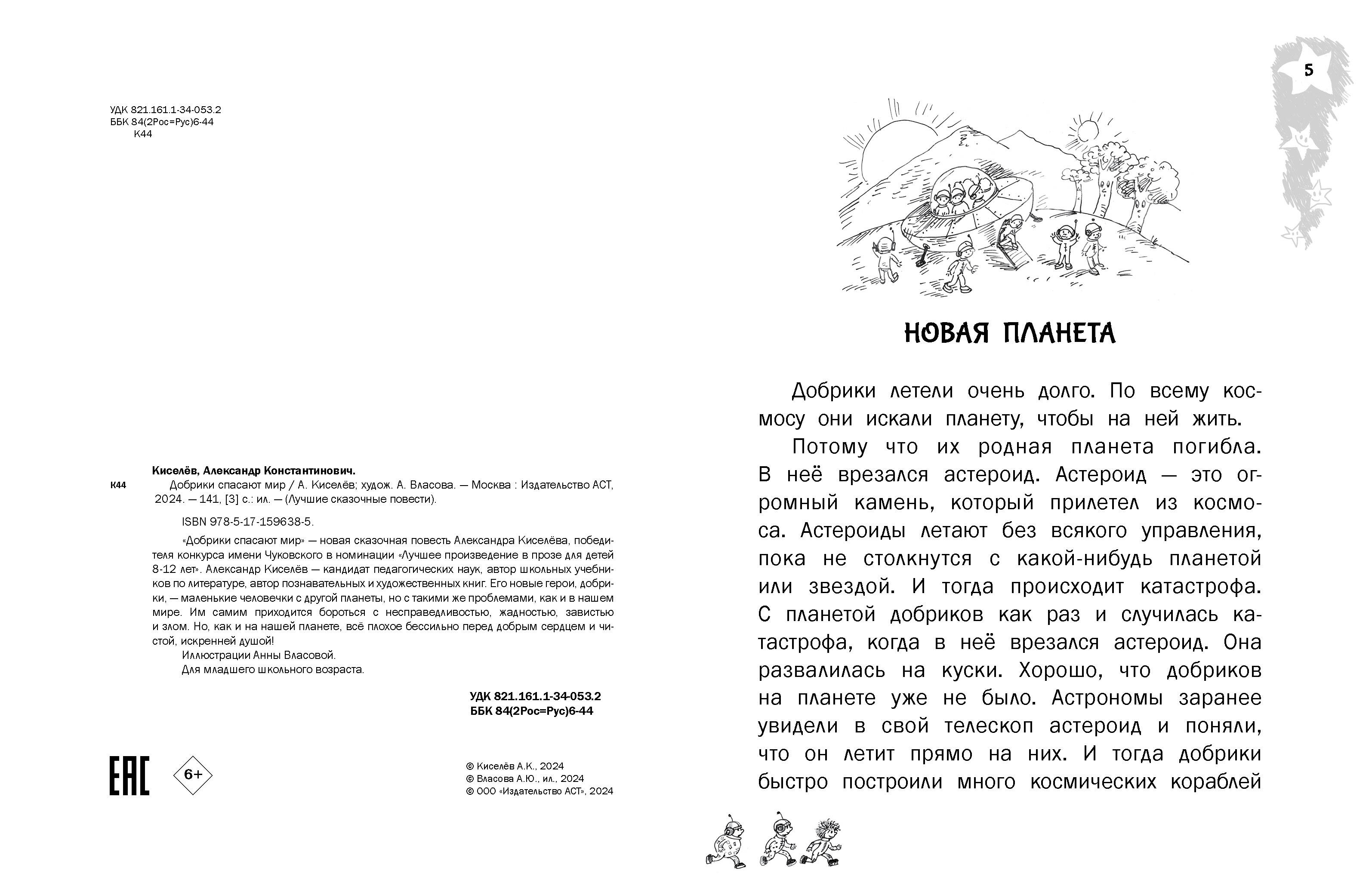 На далёкой-далёкой планете живут маленькие человечки - добрики! Это очень трудолюбивый, ответственный, справедливый и честный народец, который живёт себе поживает и горя не знает. Но однажды в их уютном мирке произошло… А что же произошло? Читайте о суперприключениях отважных добриков и помогите им справиться со всеми злодеями! Главное оружие против которых - смелость, честность, справедливость и доброе сердце. Прочитайте эту космическую сказочную повесть, а потом ответьте на вопрос: знаете ли вы добриков? Или они ещё не прилетели к нам и бороздят просторы нашей Вселенной? «Добрики спасают мир» - новая сказочная повесть Александра Киселёва, победителя конкурса имени Чуковского в номинации «Лучшее произведение в прозе для детей 8-12 лет». Александр Киселёв - кандидат педагогических наук, автор школьных учебников по литературе, автор познавательных и художественных книг. Иллюстрации Анны Власовой.| Издательство | Издательство "АСТ" |