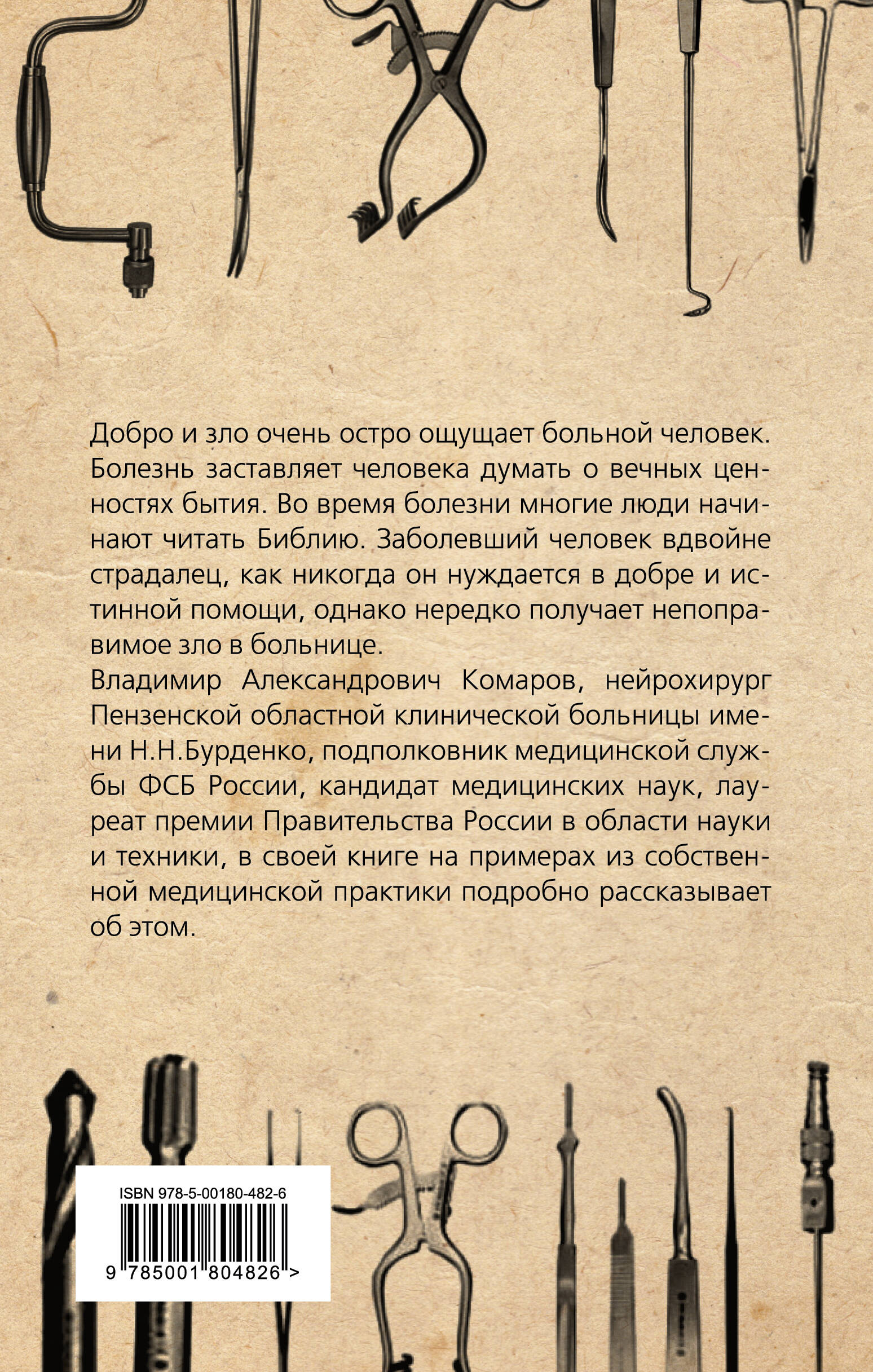 Добро и Зло очень остро ощущает больной человек. Болезнь заставляет человека думать о вечных ценностях Бытия. Во время болезни многие люди начинают читать Библию. Заболевший человек вдвойне страдалец, как никогда он нуждается в добре и истиной помощи, однако нередко он получает непоправимое зло в больнице. Владимир Александрович Комаров, нейрохирург Пензенской областной клинической больницы имени Н.Н. Бурденко, подполковник медицинской службы ФСБ России, кандидат медицинских наук, лауреат премии Правительства России в области науки и техники, в своей книге на примерах из своей медицинской практики подробно рассказывает об этом.