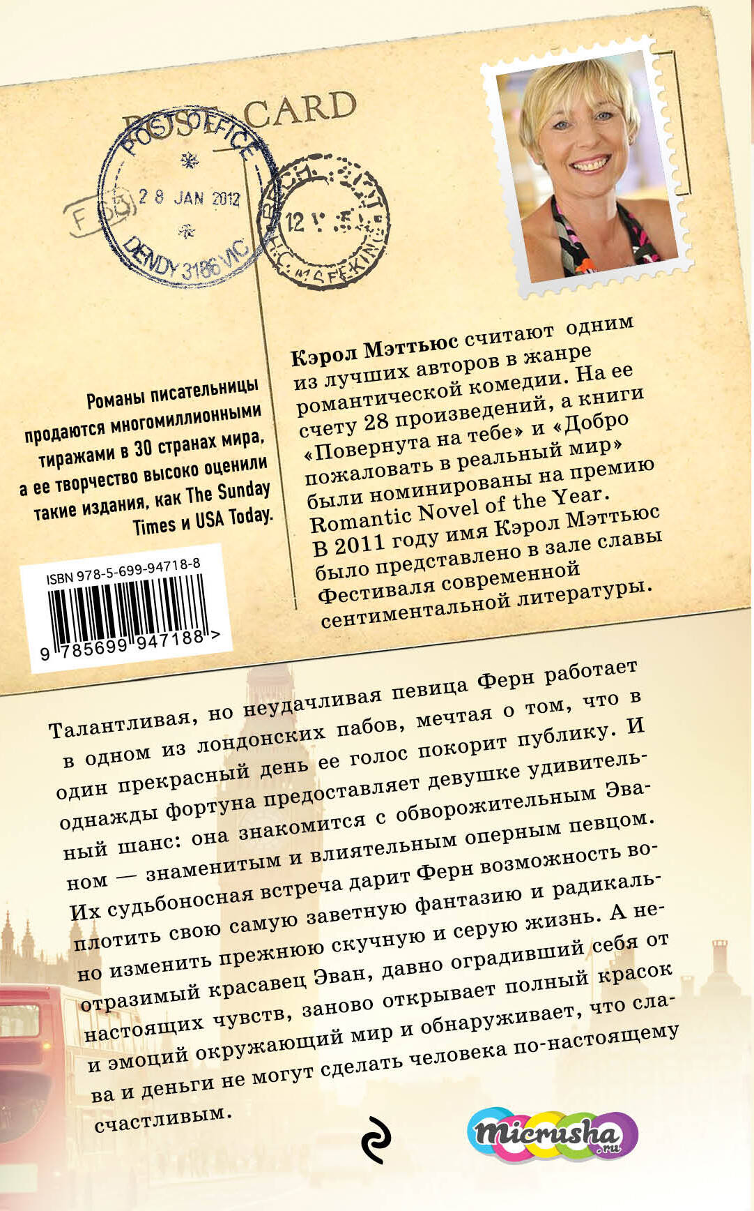 О чем Ферн - молодая талантливая певица, которая, к сожалению, пока не может пробиться на эстраду, поэтому решает до поры до времени работать в одном из лондонских пабов, втайне мечтая о дне, когда ее голос покорит мир. К счастью, судьба дает девушке чудесный шанс, сведя ее с Эваном, знаменитым оперным певцом. Это дарит ряд возможностей обоим героям: Ферн теперь может всерьез задуматься о карьере своей мечты, а Эван - заново открыть окружающий мир, полный красок и неожиданностей, и понять, что же на самом деле делает человека счастливым. Для кого Для романтичных натур, ищущих в литературе чувственности и нежности. Для тех, кто верит в судьбу и встречи, способные перевернуть жизнь с ног на голову. Для читателей, истосковавшихся по искренним и легким историям с красивым сюжетом. На что похоже Общее настроение романа и его чувственность делают «Добро пожаловать в реальный мир» похожим на произведение Сары Джио «Тихие слова любви», где каждая страница недвусмысленно дает понять, что у судьбы свои планы на нас и эти планы бывают очень и очень приятными.