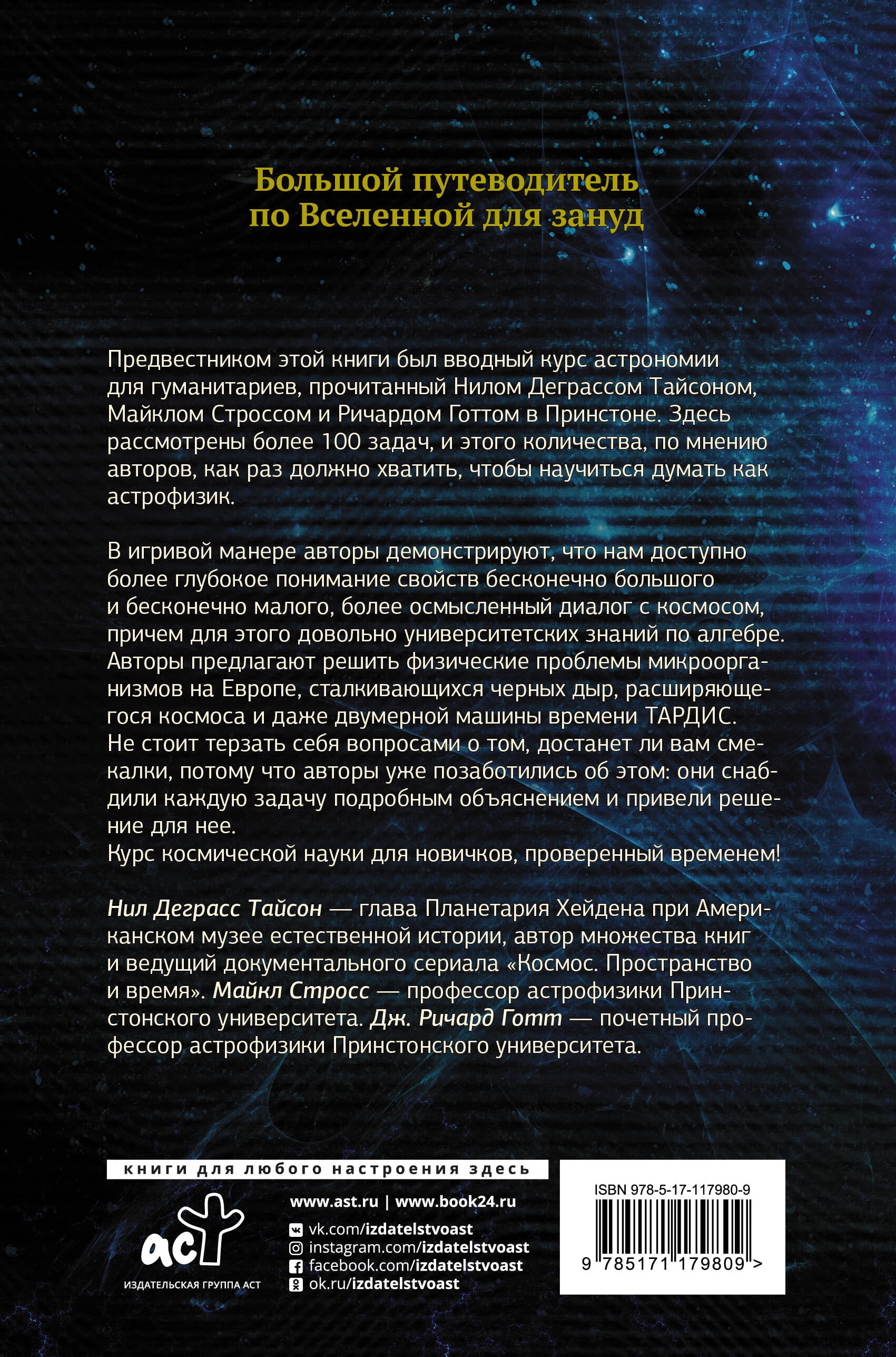 Предвестником этой книги был вводный курс астрономии для гуманитариев, прочитанный Нилом Деграссом Тайсоном, Майклом Строссом и Ричардом Готтом в Принстоне. Здесь рассмотрены более 100 задач, и этого количества, по мнению авторов, как раз должно хватить, чтобы научиться думать как астрофизик. В игривой манере авторы демонстрируют, что нам доступно более глубокое понимание свойств бесконечно большого и бесконечно малого, более осмысленный диалог с космосом, причем для этого довольно университетских знаний по алгебре. Авторы предлагают решить физические проблемы микроорганизмов на Европе, сталкивающихся черных дыр, расширяющегося космоса и даже двумерной машины времени ТАРДИС. Не стоит терзать себя вопросами о том, достанет ли вам смекалки, потому что авторы уже позаботились об этом: они снабдили каждую задачу подробным объяснением и привели решение для нее. Курс космической науки для новичков, проверенный временем!| Издательство | ИЗДАТЕЛЬСТВО "АСТ" |