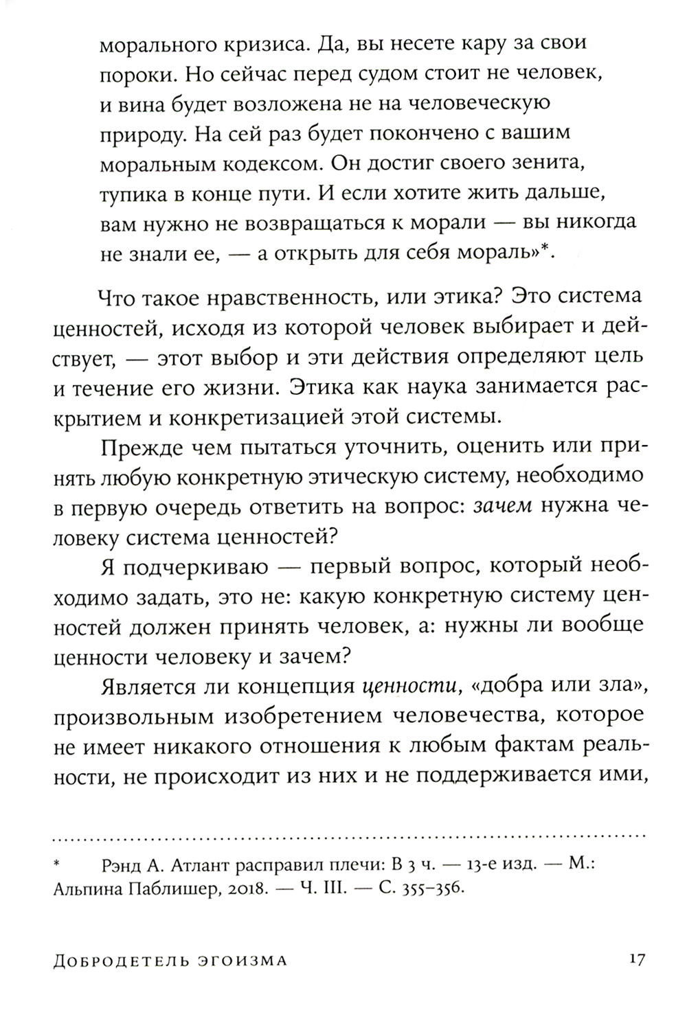 Айн Рэнд (1905-1982) - наша бывшая соотечественница, крупнейшая американская писательница, чьи книги оказали мощнейшее влияние на мировоззрение миллионов людей во всем мире, автор признанных бестселлеров - «Атлант расправил плечи», «Источник», «Гимн» и др. Книга «Добродетель эгоизма» представляет собой сборник статей, написанных Айн Рэнд в разные годы и объединенных одной темой - защитой концепции «разумного эгоизма» как этической основы свободного капиталистического общества. Автор на редкость живо и убедительно доказывает, что только в рамках системы, которая ставит во главу угла права личности и разум, люди могут свободно развиваться и обретать счастье, не оказываясь порабощенными диктаторами, государством и другими людьми. А значит - только такую систему можно признать нравственной и соответствующей человеческой природе.| Издательство | Альпина Паблишер |