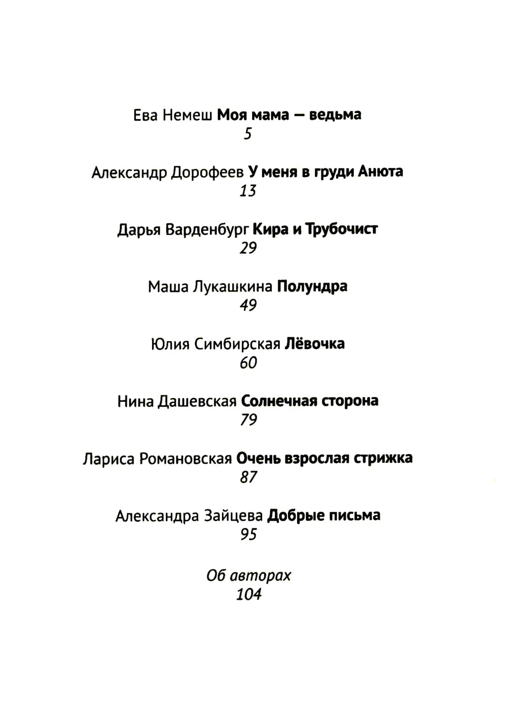 Порой так хочется получить весточку, знак, какой-нибудь самый туманный намек, что все будет хорошо. Вадик впитывает каждую букву (и цифру) из случайно найденного старого школьного дневника и понимает, как они с отцом похожи. Марк вместе с родителями застрял из-за непогоды и карантина в чужом городе, но в их временном доме есть балкон на солнечной стороне. Даша рождественской ночью читает открытки со всего света от совершенно незнакомых людей и теперь ничуть не сомневается, что мама поправится. Добрым письмом может стать все что угодно: бездомный котенок, кусачая собака, итоговое сочинение, несносный младший брат. Замечайте добрые письма и посылайте свои - всем, кто ждет. «Добрые письма» - десятый сборник серии «Рассказы Волчка». В него вошли истории Дарьи Варденбург, Нины Дашевской, Александра Дорофеева, Александры Зайцевой, Маши Лукашкиной, Евы Немеш, Ларисы Романовской, Юлии Симбирской.| Издательство | Волчок |