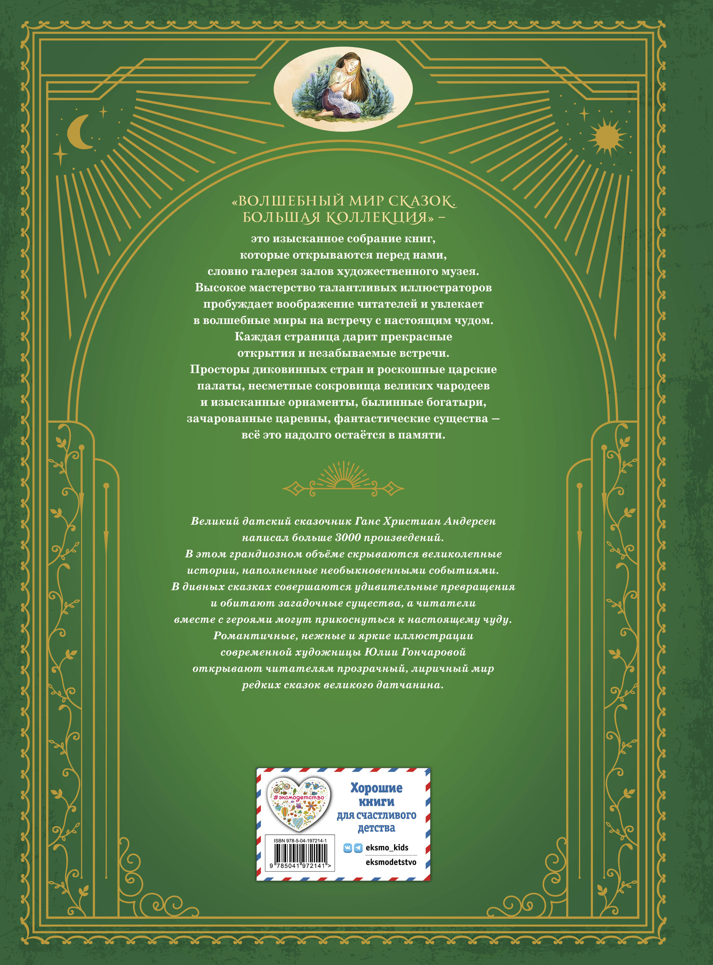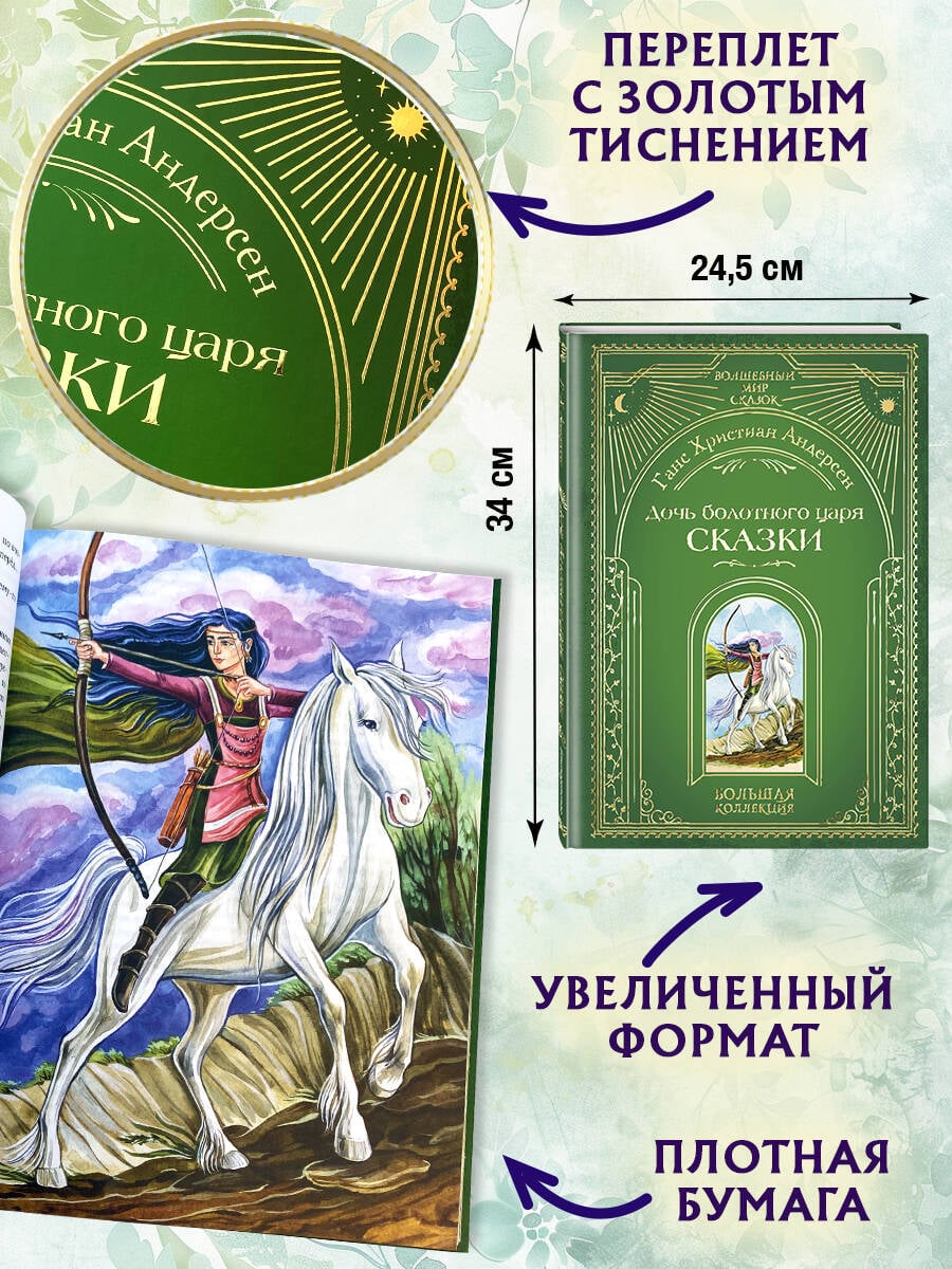 ВЕЛИКОЛЕПНОЕ ПОДАРОЧНОЕ ИЗДАНИЕ В ИЗЫСКАННОМ И СТИЛЬНОМ ОФОРМЛЕНИИ! Книга большого формата (24х32,5 см). Твёрдый переплёт с золотым тиснением и частичным лаком. Цветные форзацы. Плотная бумага. Чёткий, удобный для чтения шрифт. Красочные иллюстрации. Книги серии «Волшебный мир сказок. Большая коллекция» - это приглашение в удивительное путешествие по таинственным мирам, ставшим зримыми и осязаемыми благодаря искусству художников. Лучшие мастера книжной иллюстрации подарят вам незабываемые впечатления от встречи со сказкой. Среди почти 3000 сказок великого датского писателя Ганса Христиана Андерсена есть произведения для читателей всех возрастов и взглядов: и романтические истории, получившие громкую мировую славу и притчи, наполненные глубокими смыслами. В новый сборник «Дочь болотного царя» вошли 16 редких сказок Г.-Х. Андерсена, в том числе «Дочь болотного царя», «Суп из колбасной палочки», «Иб и Христиночка», «Последняя жемчужина» и другие. Классический перевод Анны и Петра Ганзен и выразительные, изящные иллюстрации Юлии Гончаровой сделают эту книгу прекрасным подарком к любому празднику. С незапамятных времён люди придумывали необыкновенные страны, населяли их чудесными существами и рассказывали диковинные истории об удивительных событиях, происходивших «в некотором царстве, в некотором государстве». Так появились сказки, без которых сегодня мы не можем представить детство. Волшебные или очень похожие на правду, страшные или смешные, народные или литературные - все они увлекали слушателей своей необычностью, загадочностью, передавали от предков и закладывали в сердца бесценные сокровища: вековую мудрость, понимание добра и зла, неписаные правила жизни, - и так формировали уникальный культурный код наций и народов.| Издательство | ООО "Издательство "Эксмо" |