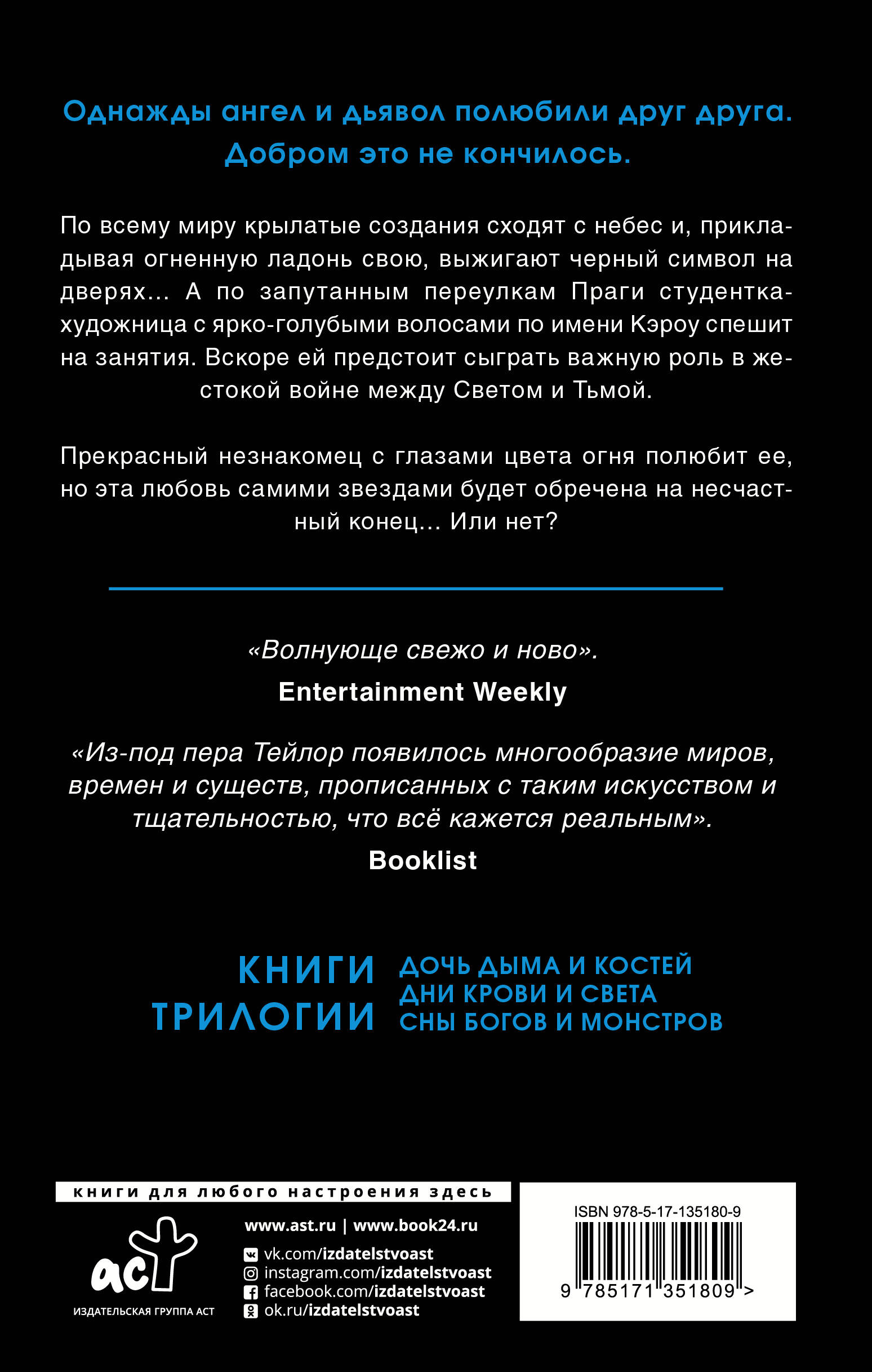 По всему миру ангелы сходят с небес и, прикладывая огненную ладонь свою, оставляют символ на дверях… В пыльной темноте старой лавочки ужасное создание собирает ингредиенты для черных ритуалов темной магии. А по запутанным переулкам Праги Кэроу - студентка-художница, спешит на занятия. Она рисует в альбоме чудовищ - и все думают, что они лишь плод ее воображения. Она говорит на многих языках - но не все из них человеческие. У нее ярко-голубые волосы - но это не результат модной краски. Кэроу постоянно исчезает по таинственным "поручениям". Кто же она? И какая роль ей предстоит в грядущей войне между Светом и Тьмой?| Издательство | Издательство "АСТ" |