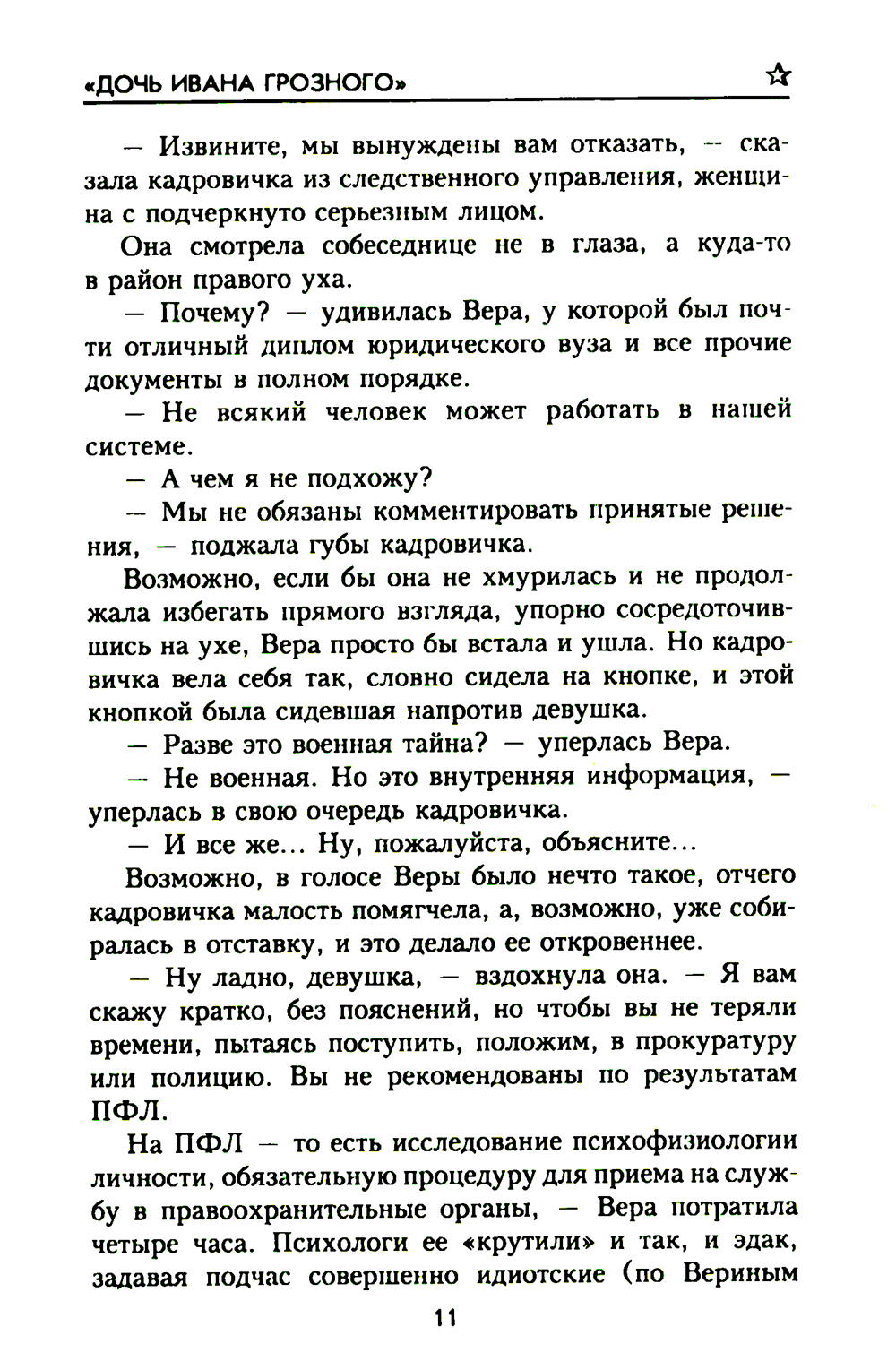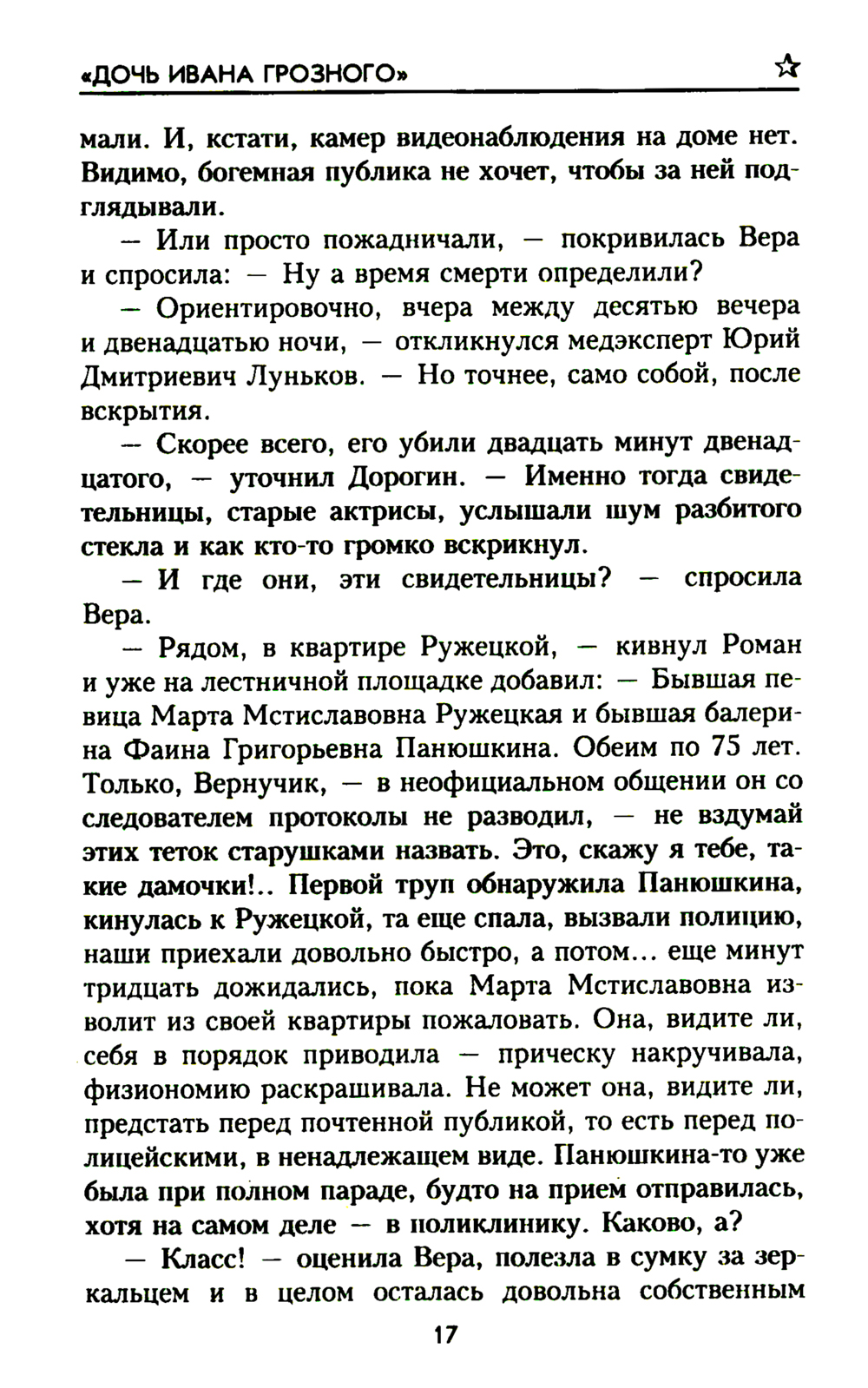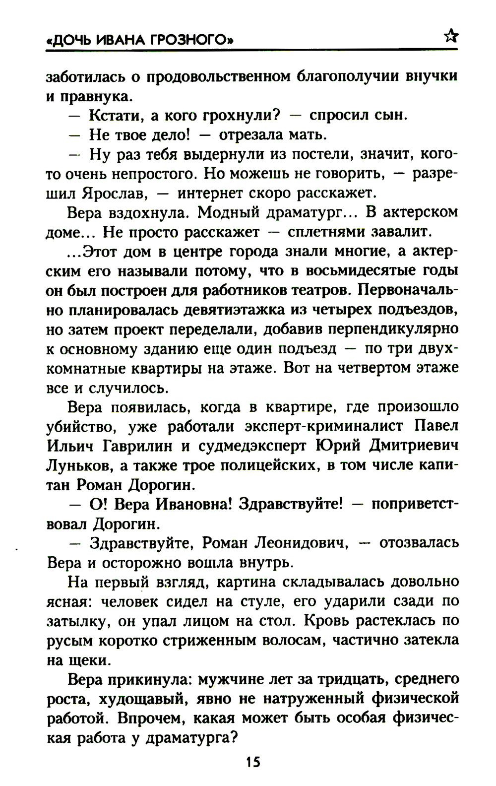 Модный московский драматург Кирилл Лепешкин приезжает в родной город, где идут репетиции его последней пьесы «Дочь Ивана Грозного». Эта пьеса действительно окажется для него последней, поскольку в один из вечеров он будет убит у себя дома. Более того, выяснится, что в течение нескольких дней Лепешкина постепенно травили ядом. Следователю СК Вере Ивановне Грозновой предстоит получить ответы на целый ряд вопросов. С кем Кирилл, живший очень уединенно, встречался в тот злополучный вечер? Почему он никогда не расставался с портфелем, в котором лежали только две панки с текстом пьесы, причем в одной из них - черновик? Какую роль в популярности драматурга сыграла театральный критик Гертруда Стрекалова? Что за тайну скрывает бизнесмен Виктор Гонтарев, проспонсировавший постановку данной пьесы?| Издательство | Вече |