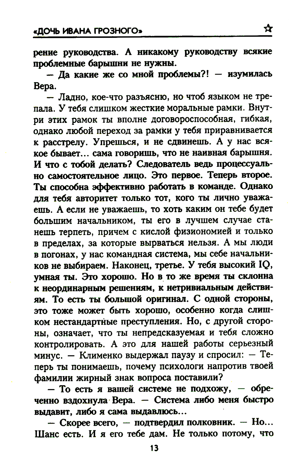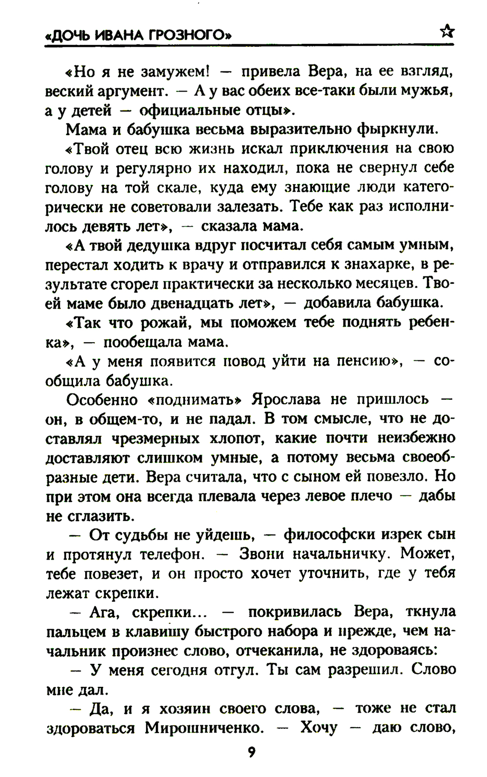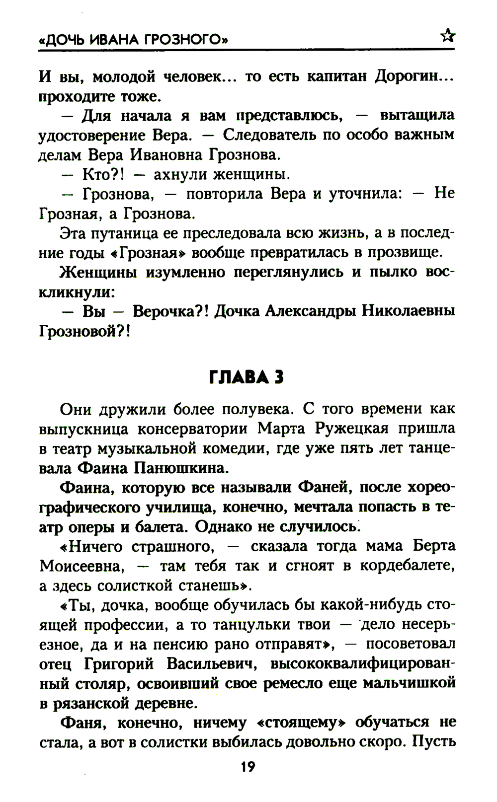 Модный московский драматург Кирилл Лепешкин приезжает в родной город, где идут репетиции его последней пьесы «Дочь Ивана Грозного». Эта пьеса действительно окажется для него последней, поскольку в один из вечеров он будет убит у себя дома. Более того, выяснится, что в течение нескольких дней Лепешкина постепенно травили ядом. Следователю СК Вере Ивановне Грозновой предстоит получить ответы на целый ряд вопросов. С кем Кирилл, живший очень уединенно, встречался в тот злополучный вечер? Почему он никогда не расставался с портфелем, в котором лежали только две панки с текстом пьесы, причем в одной из них - черновик? Какую роль в популярности драматурга сыграла театральный критик Гертруда Стрекалова? Что за тайну скрывает бизнесмен Виктор Гонтарев, проспонсировавший постановку данной пьесы?| Издательство | Вече |