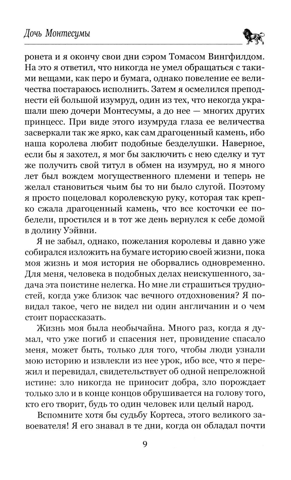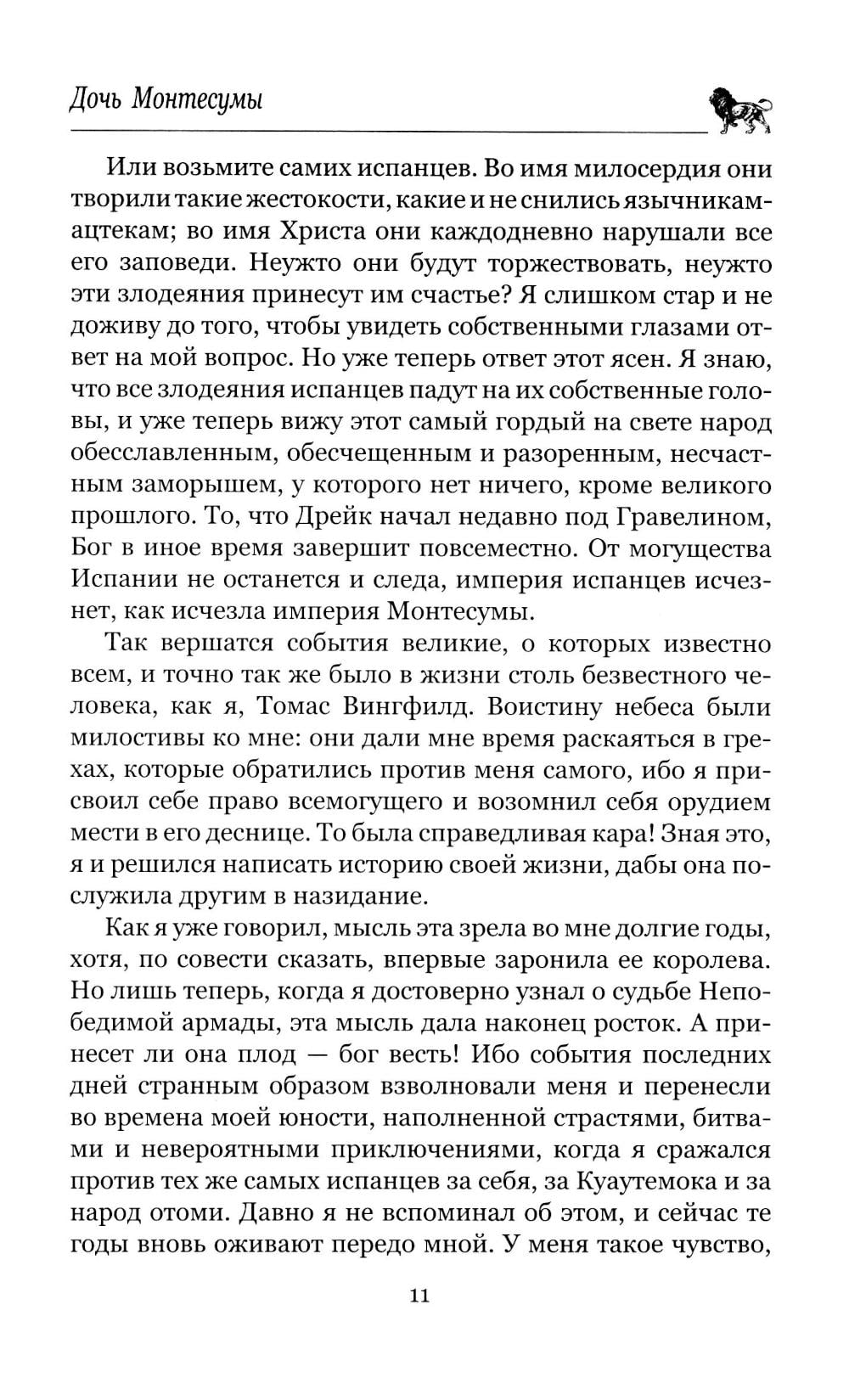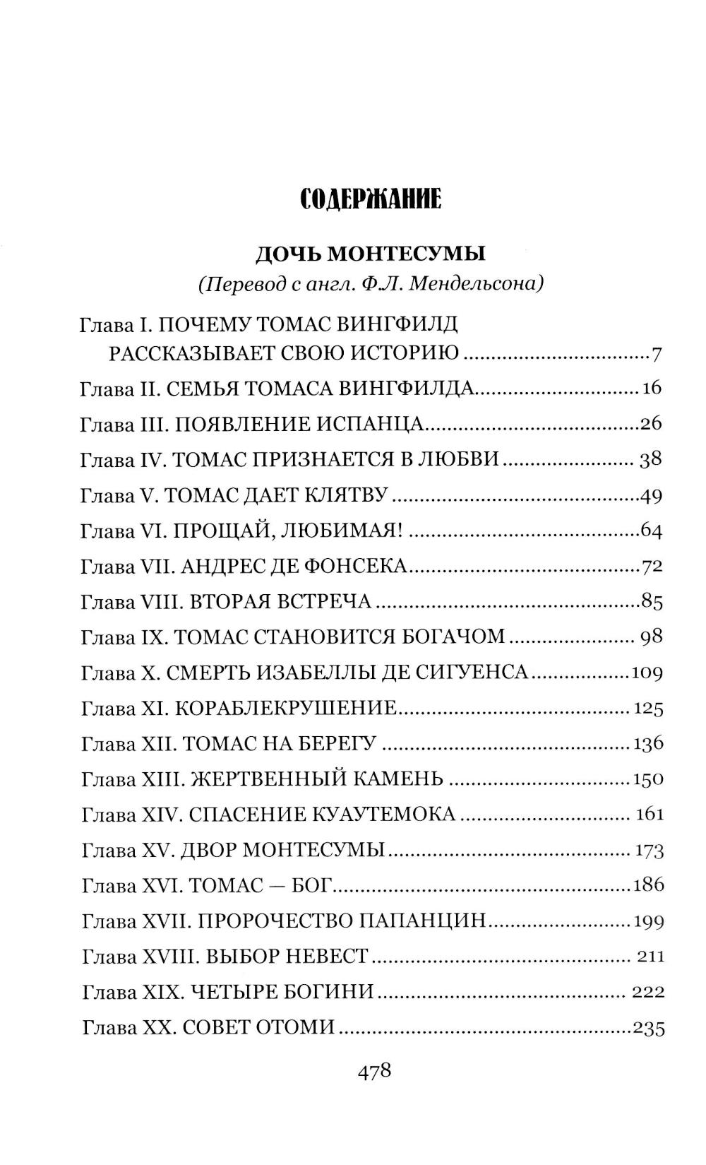 XVI век. Запах золота, крови и грабежа стелется по суше и по морю. Идет противостояние Англии и Испании. Непобедимая армада и корабли Дрейка грузят порох и расправляют паруса, а гордые конкистадоры Кортеса, прикрыв лохмотья своих душ сверкающими на солнце латами, методично седлают коней. Всех ждет добыча. В самое сердце империи Монтесумы попадает молодой англичанин Томас Вингфилд, пленник долга и чести. Движет им смутная и злая надежда - найти и отомстить во что бы то ни стало. Враг впереди, враг позади, враг всегда где-то рядом. Все решит последняя схватка. А там - если что останется... В очередной том избранных произведений Генри Райдера Хаггарда включен роман «Дочь Монтесумы», дополненный оригинальным посвящением и комментариями автора.