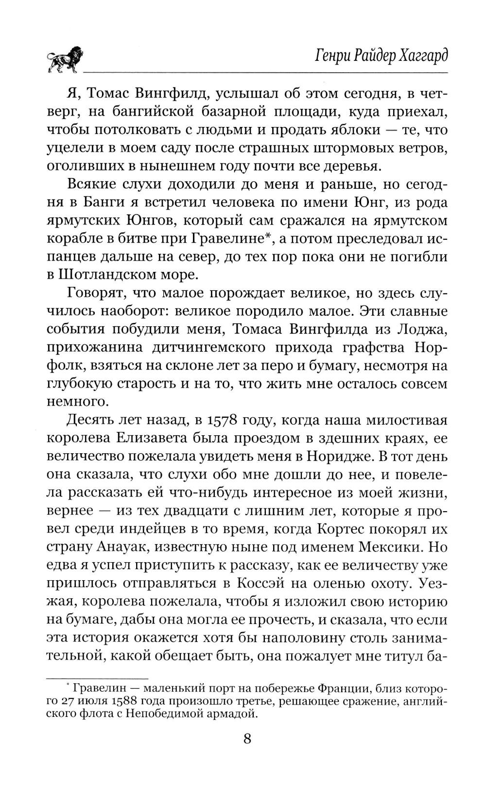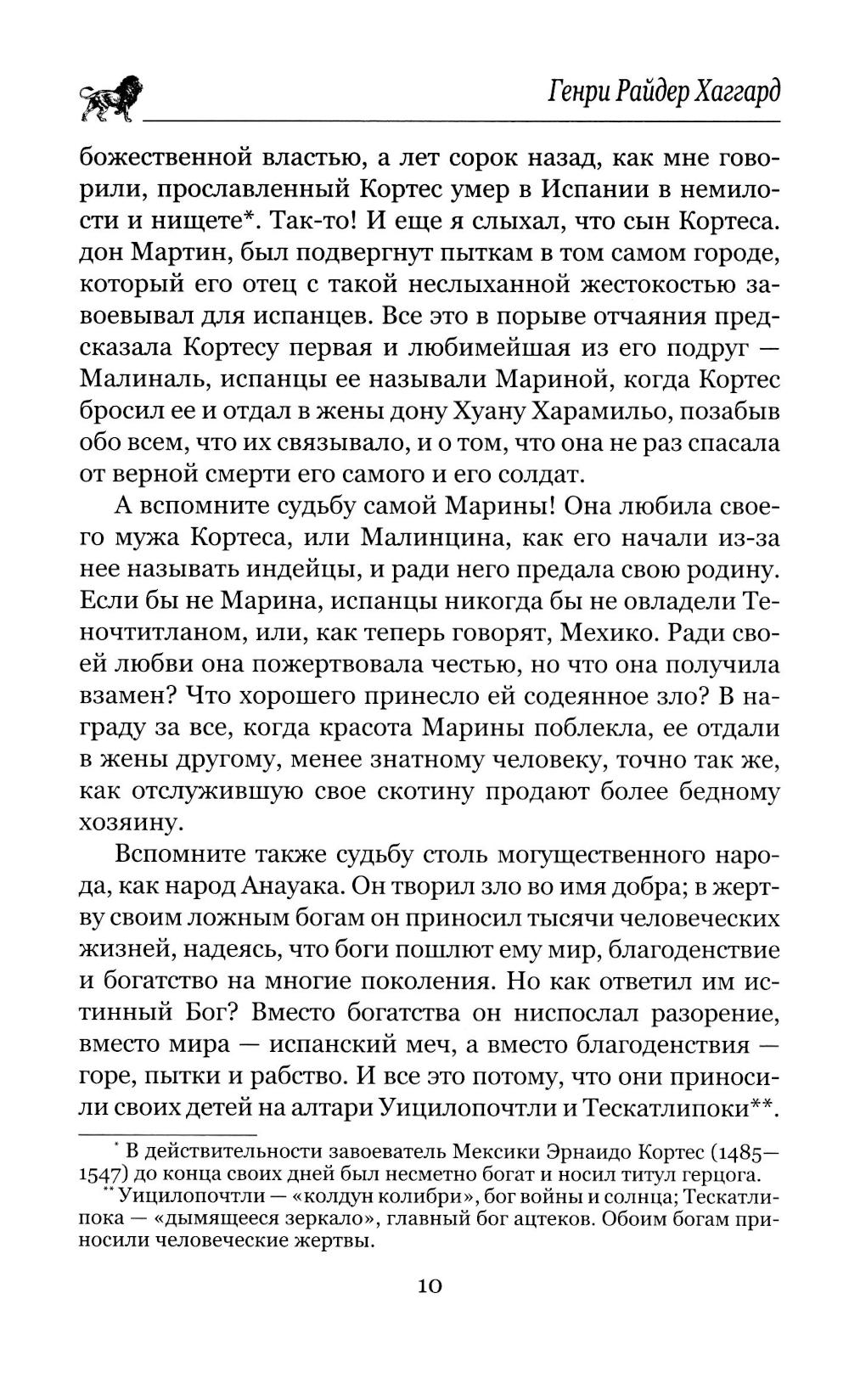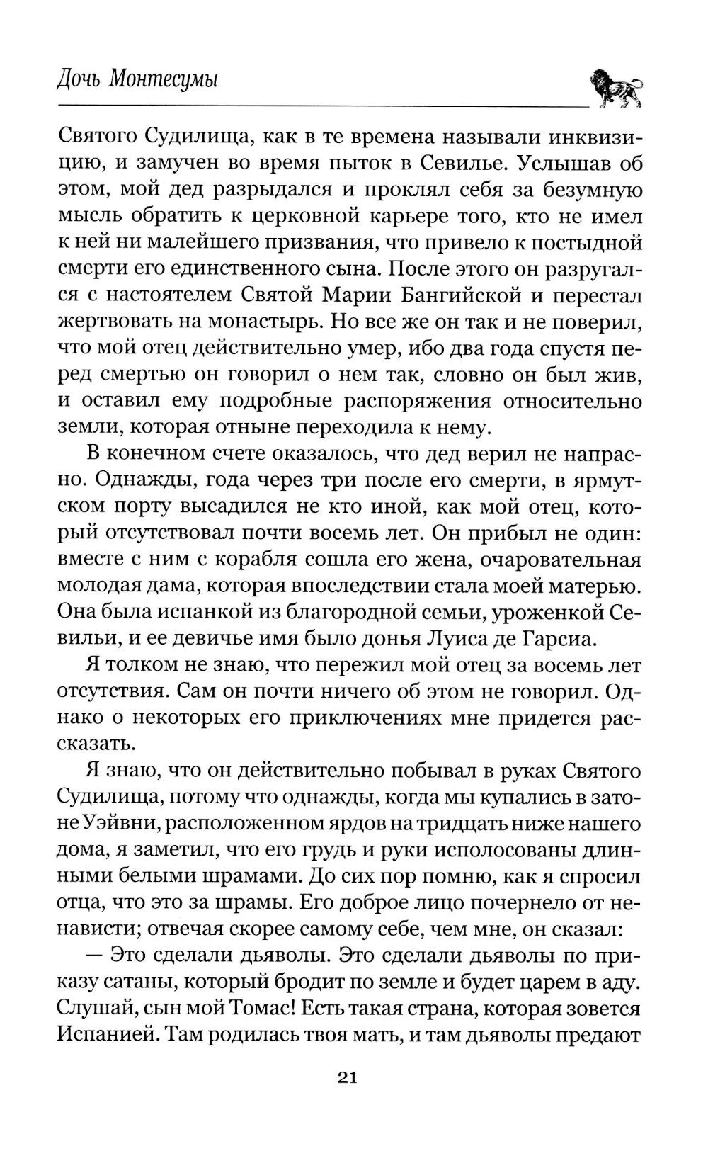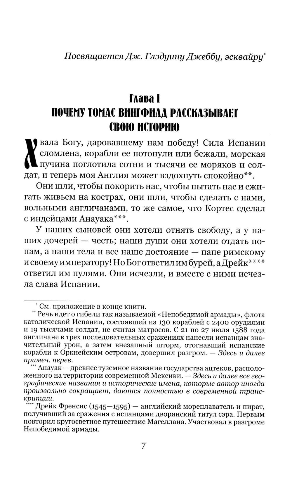 XVI век. Запах золота, крови и грабежа стелется по суше и по морю. Идет противостояние Англии и Испании. Непобедимая армада и корабли Дрейка грузят порох и расправляют паруса, а гордые конкистадоры Кортеса, прикрыв лохмотья своих душ сверкающими на солнце латами, методично седлают коней. Всех ждет добыча. В самое сердце империи Монтесумы попадает молодой англичанин Томас Вингфилд, пленник долга и чести. Движет им смутная и злая надежда - найти и отомстить во что бы то ни стало. Враг впереди, враг позади, враг всегда где-то рядом. Все решит последняя схватка. А там - если что останется... В очередной том избранных произведений Генри Райдера Хаггарда включен роман «Дочь Монтесумы», дополненный оригинальным посвящением и комментариями автора.