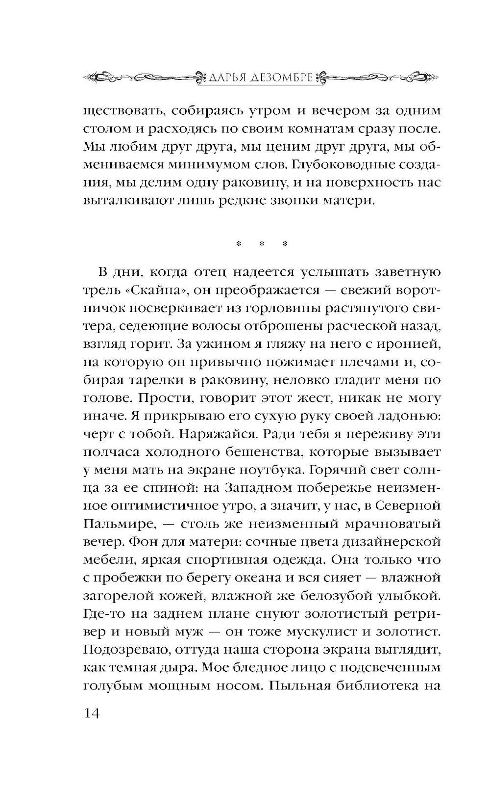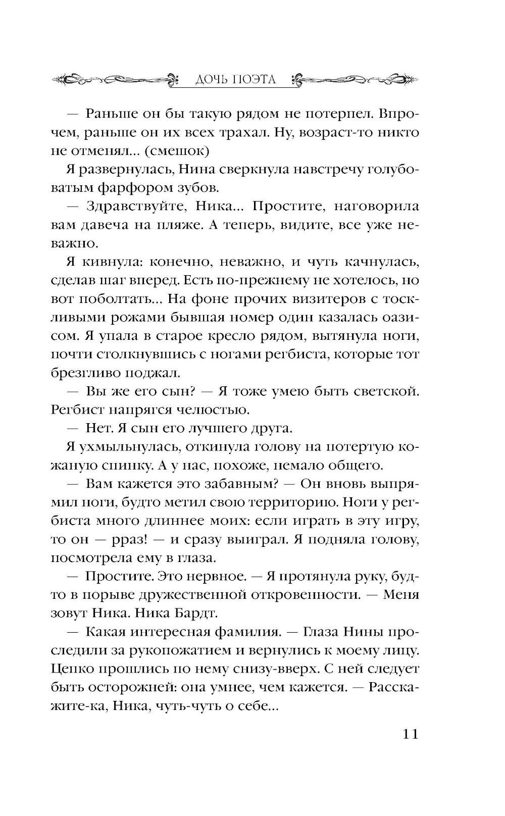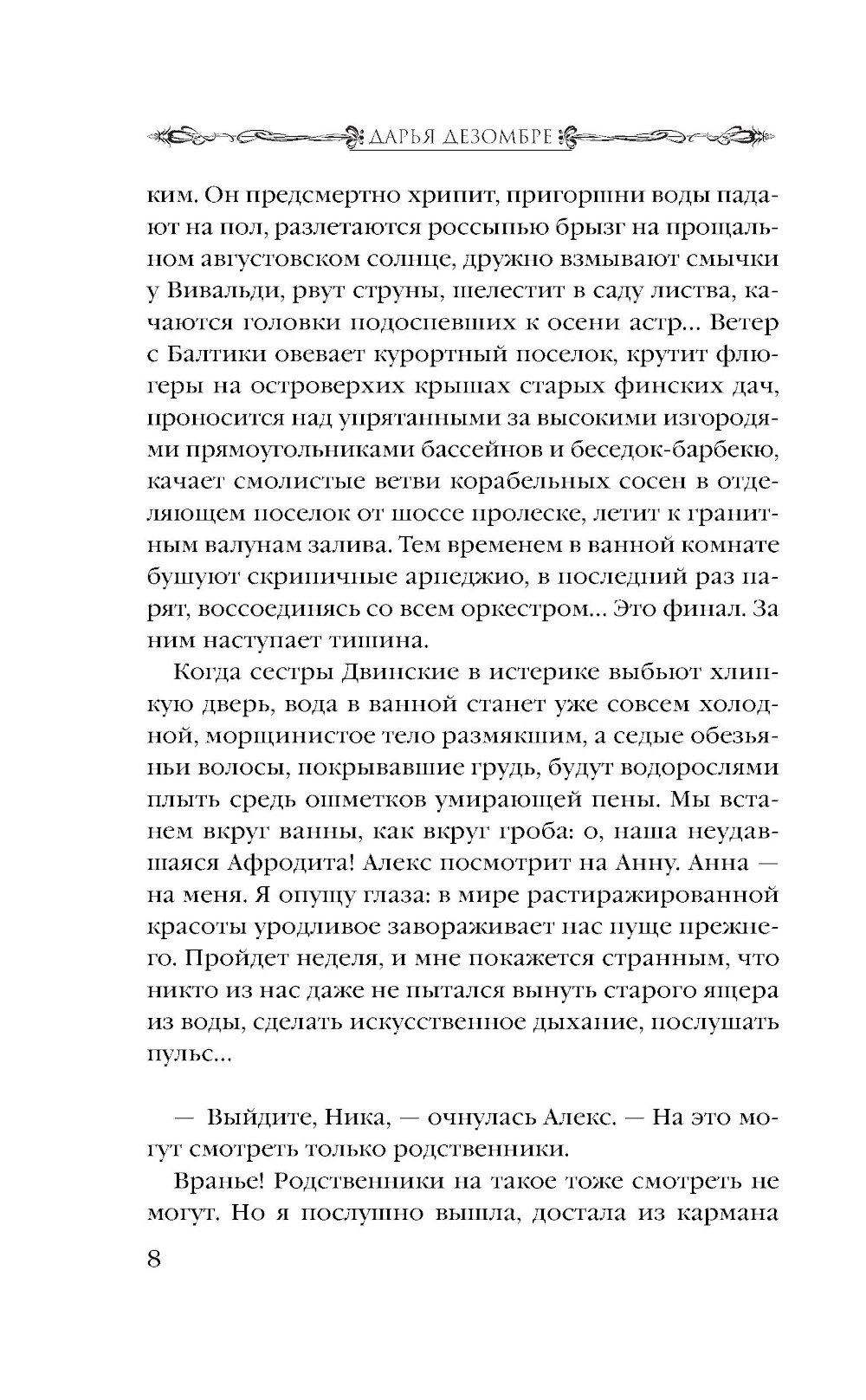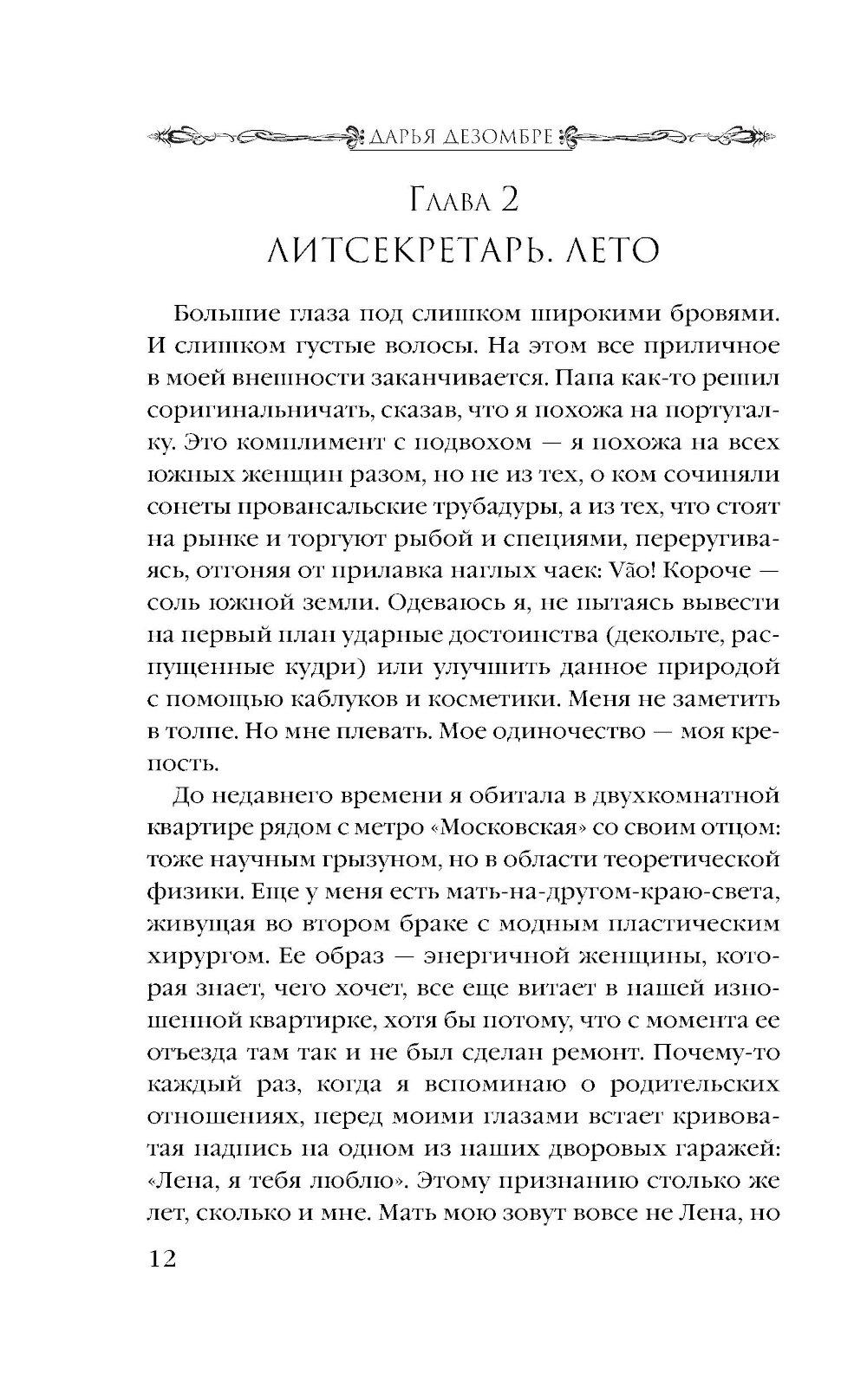 Специалист по романтической поэзии начала XIX в. аспирантка Ника соглашается на подработку литсекретарем у знаменитого поэта. Поэт вводит Нику в свой домашний круг на даче у Финского залива и... внезапно умирает. Несчастный случай? Сердечный приступ? Суицид? Однако сын поэта от первого брака подозревает убийство и нанимает Нику: официально разобрать архивы покойного. Неофициально - докопаться до истины. Но что, если каждый из членов семьи имеет и мотив для убийства, и возможность? А сама Ника вовсе не случайно появилась на старой фамильной даче?.. Детективы Дарьи Дезомбре отличает наличие тонкой интриги, мистических тайн и детального экскурса в историю, культуру и искусство. Над каждой новой книгой Дезомбре работает кропотливо. Воссоздавая прошлое, она читает мемуары, проводит много часов в библиотеках и музеях, собирает фотографии одежды и предметов прошлых эпох из семейных альбомов, журналов.| Издательство | Эксмо |