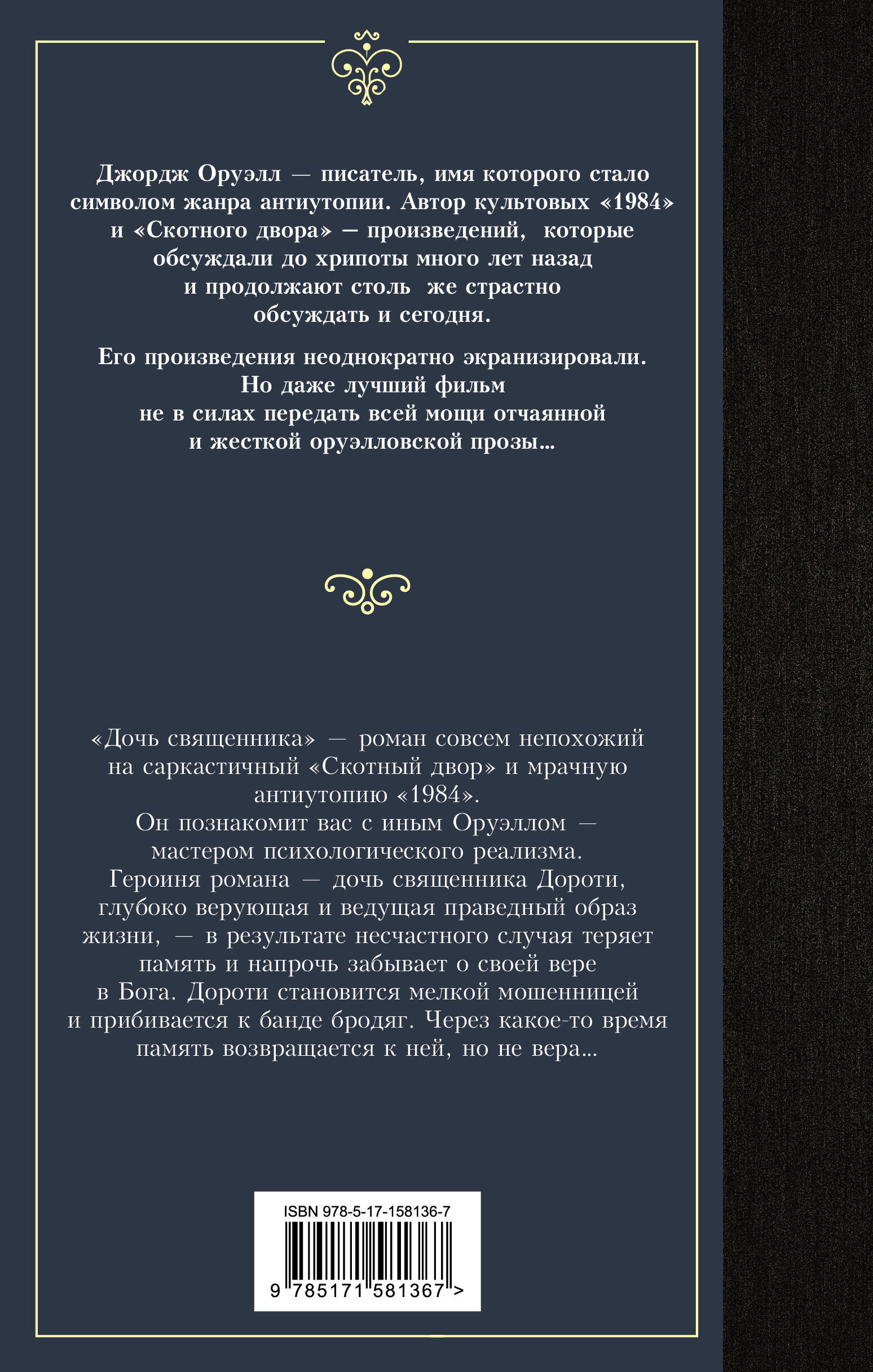 "Дочь священника" - роман совсем не похожий на саркастичный "Скотный Двор" и мрачную антиутопию "1984". Роман, который познакомит вас и иным Оруэллом - мастером психологического реализма. Героиня романа - дочь священника Дороти, глубоко верующая и ведущая праведный образ жизни, - в результате несчастного случая теряет память и напрочь забывает о своей вере в Бога. Дороти становится мелкой мошенницей и прибивается к банде бродяг. Через какое-то время память возвращается к ней, но не вера....| Издательство | ИЗДАТЕЛЬСТВО "АСТ" |