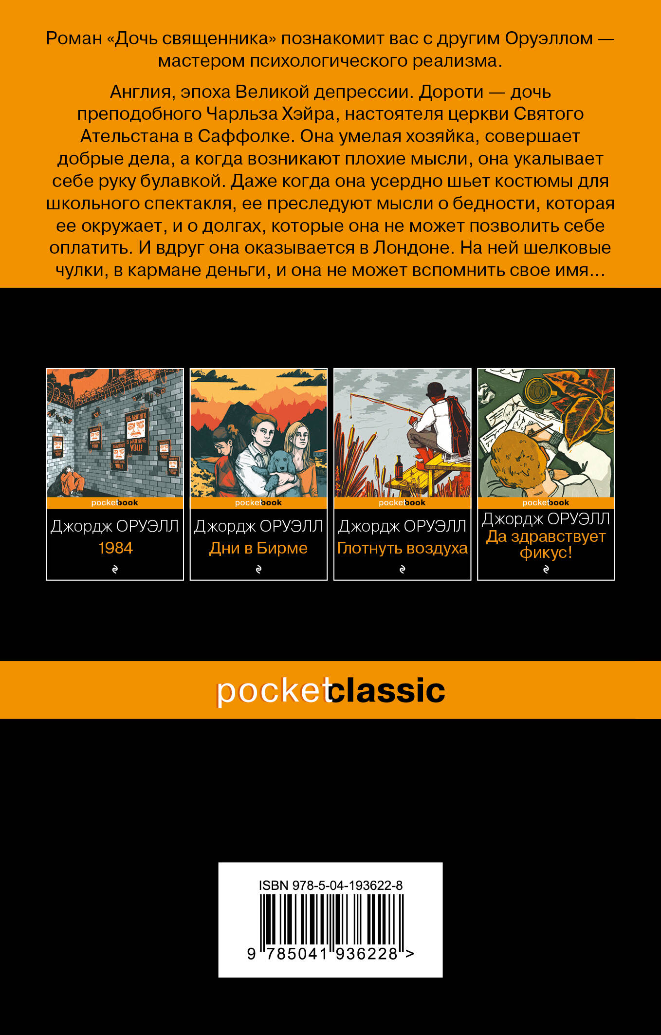 Многие привыкли воспринимать Оруэлла только в ключе жанра антиутопии, но роман «Дочь священника» познакомит вас с другим Оруэллом - мастером психологического реализма. Англия, эпоха Великой депрессии. Дороти - дочь преподобного Чарльза Хэйра, настоятеля церкви Святого Ательстана в Саффолке. Она умелая хозяйка, совершает добрые дела, старается культивировать в себе только хорошие мысли, а когда возникают плохие, она укалывает себе руку булавкой. Даже когда она усердно шьет костюмы для школьного спектакля, ее преследуют мысли о бедности, которая ее окружает, и о долгах, которые она не может позволить себе оплатить. И вдруг она оказывается в Лондоне. На ней шелковые чулки, в кармане деньги, и она не может вспомнить свое имя... Это роман о девушке, которая потеряла память из-за несчастного случая, она заново осмысливает для себя вопросы веры и идентичности в мире безработицы и голода.| Издательство | ООО "Издательство "Эксмо" |