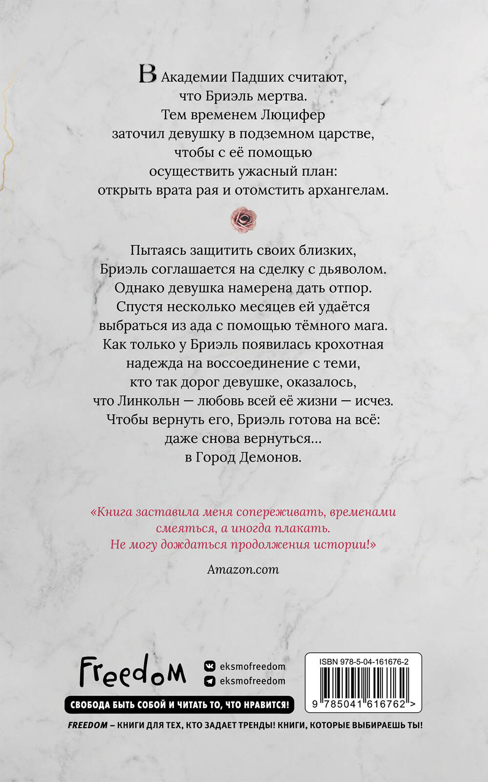 Для фанатов «Ангельской саги» Мары Вульф и «Изары» Юлии Диппель! Совершенно новая история об ангелах и демонах, которая происходит на территории современного Лос-Анджелеса! В Академии Падших считают, что Бриэль мертва. Тем временем Люцифер заточил девушку в подземном царстве, чтобы с ее помощью осуществить ужасный план: открыть врата рая и отомстить архангелам. Пытаясь защитить своих близких, Бриэль cоглашается на сделку с дьяволом. Однако девушка намерена дать отпор. Спустя несколько месяцев ей удается выбраться из ада с помощью темного мага. Как только у Бриэль появилась крохотная надежда на воссоединение с теми, кто так дорог девушке, оказалось, что Линкольн - любовь всей ее жизни - исчез. Чтобы вернуть его, Бриэль готова на все: даже снова вернуться… в Город Демонов. «Книга заставила меня сопереживать, временами смеяться, а иногда плакать. Не могу дождаться продолжения истории!» - Amazon.com| Издательство | ООО "Издательство "Эксмо" |