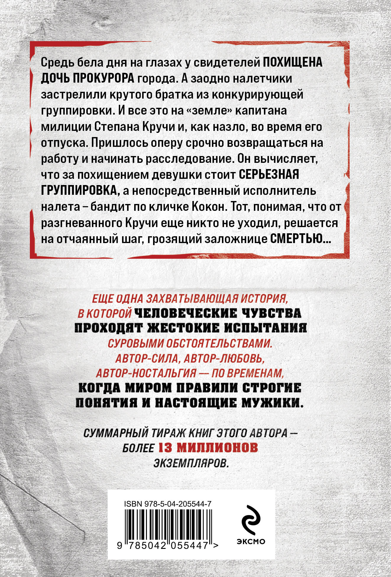 Средь бела дня на глазах у свидетелей похищена дочь прокурора города. А заодно налетчики застрелили крутого братка из конкурирующей группировки. И все это на «земле» капитана милиции Степана Кручи и, как назло, во время его отпуска. Пришлось оперу срочно возвращаться на работу и начинать расследование. Он вычисляет, что за похищением девушки стоит серьезная группировка, а непосредственный исполнитель налета - бандит по кличке Кокон. Тот, понимая, что от разгневанного Кручи еще никто не уходил, решается на отчаянный шаг, грозящий заложнице смертью… Еще одна захватывающая история, в которой человеческие чувства проходят жестокие испытания суровыми обстоятельствами. Автор-сила, автор-любовь, автор-ностальгия - по временам, когда миром правили строгие понятия и настоящие мужики. Суммарный тираж книг этого автора - более 13 миллионов экземпляров.