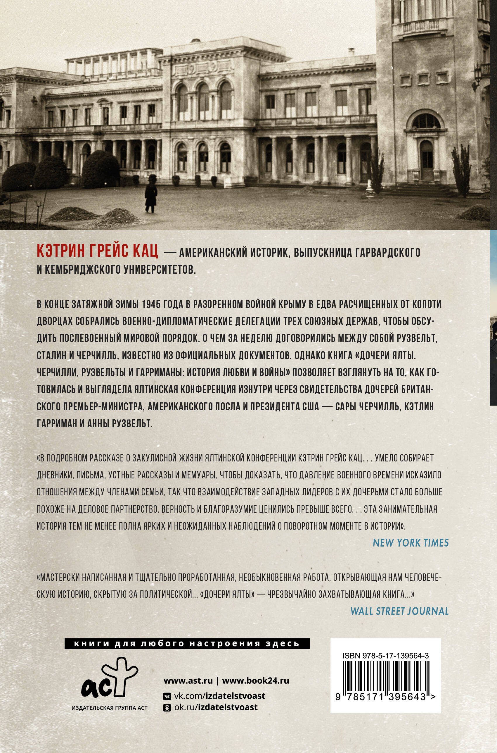 Кэтрин Грейс Кац - американский историк, выпускница Гарвардского и Кембриджского университетов. В своей книге «Дочери Ялты. Черчилли, Рузвельты и Гарриманы: история любви и войны» автор воссоздает события восьмидневной Ялтинской конференции, на которой решилась судьба послевоенного мира. Из книги читатель узнает о том, какими представали события конференции с точки зрения дочерей главных ее участников - Кэтлин Гарриман, Сары Черчилль и Анны Рузвельт - и о том, какой была повседневная жизнь жителей Ливадийского дворца. Книга будет интересна всем, кто хочет узнать больше о Второй мировой войне и событиях мировой истории конца 1940-х годов. Книга небольшого формата, легкая, что позволяет взять ее с собой в дорогу.| Издательство | ИЗДАТЕЛЬСТВО "АСТ" |