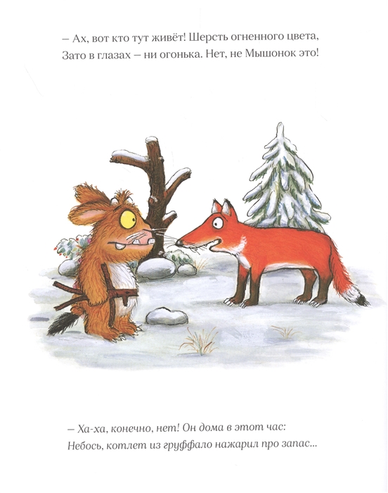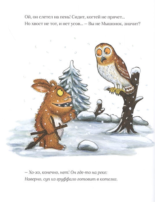 ...Так сказал папаша Груффало, но однажды ночью малютка-груффало обошла весь запретный лес, и вдоль и поперёк, спрашивала у лисы, совы и змеи, но грозного зверя не нашла. Теперь она знает, что все дурачили её и никакого страшного Мышонка не бывает... Или бывает?