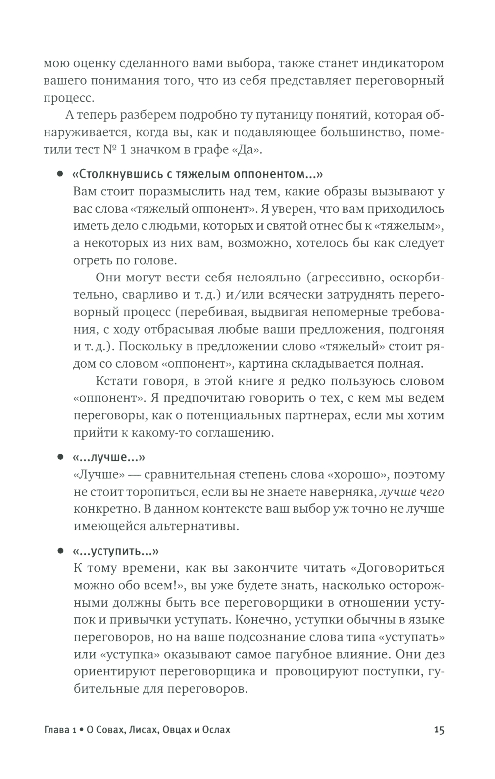 О составляющих переговорного процесса, стратегических подходах и тактических приемах. Автор рассказывает о психологических ловушках и ошибках в расстановке приоритетов, дает примеры катастрофических просчетов и ситуаций, которые еще можно исправить. Работая над заданиями, вы не раз поймаете себя на том, что поначалу пробуете решить их, руководствуясь привычными, «накатанными» методами - а они-то, как убедительно доказывает автор, чаще всего и ведут к поражению.| Издательство | Альпина Паблишер |