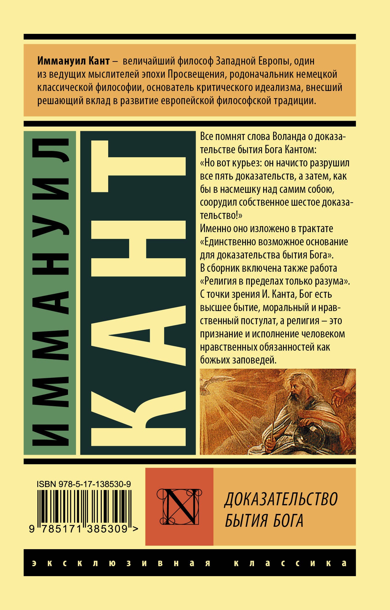 Иммануил Кант - величайший философ Западной Европы, один из ведущих мыслителей эпохи Просвещения, родоначальник немецкой классической философии, основатель критического идеализма, внесший решающий вклад в развитие европейской философской традиции. Все помнят слова Воланда о доказательстве бытия Бога Кантом: "Но вот курьез: он начисто разрушил все пять доказательств, а затем, как бы в насмешку над самим собою, соорудил собственное шестое доказательство!" Именно оно изложено в трактате "Единственно возможное основание для доказательства бытия Бога". В сборник включена также работа "Религия в пределах только разума". С точки зрения И. Канта, Бог есть высшее бытие, моральный и нравственный постулат, а религия - это признание и исполнение человеком нравственных обязанностей как божьих заповедей.| Издательство | ИЗДАТЕЛЬСТВО "АСТ" |