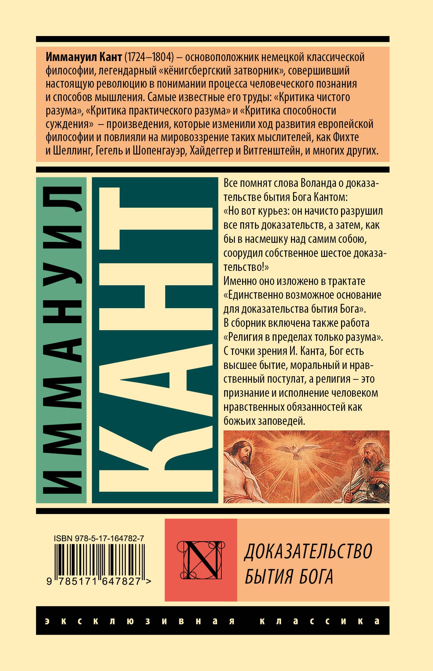 Иммануил Кант - величайший философ Западной Европы, один из ведущих мыслителей эпохи Просвещения, родоначальник немецкой классической философии, основатель критического идеализма, внесший решающий вклад в развитие европейской философской традиции. Все помнят слова Воланда о доказательстве бытия Бога Кантом: "Но вот курьез: он начисто разрушил все пять доказательств, а затем, как бы в насмешку над самим собою, соорудил собственное шестое доказательство!" Именно оно изложено в трактате "Единственно возможное основание для доказательства бытия Бога". В сборник включена также работа "Религия в пределах только разума". С точки зрения И. Канта, Бог есть высшее бытие, моральный и нравственный постулат, а религия - это признание и исполнение человеком нравственных обязанностей как божьих заповедей.| Издательство | Издательство "АСТ" |