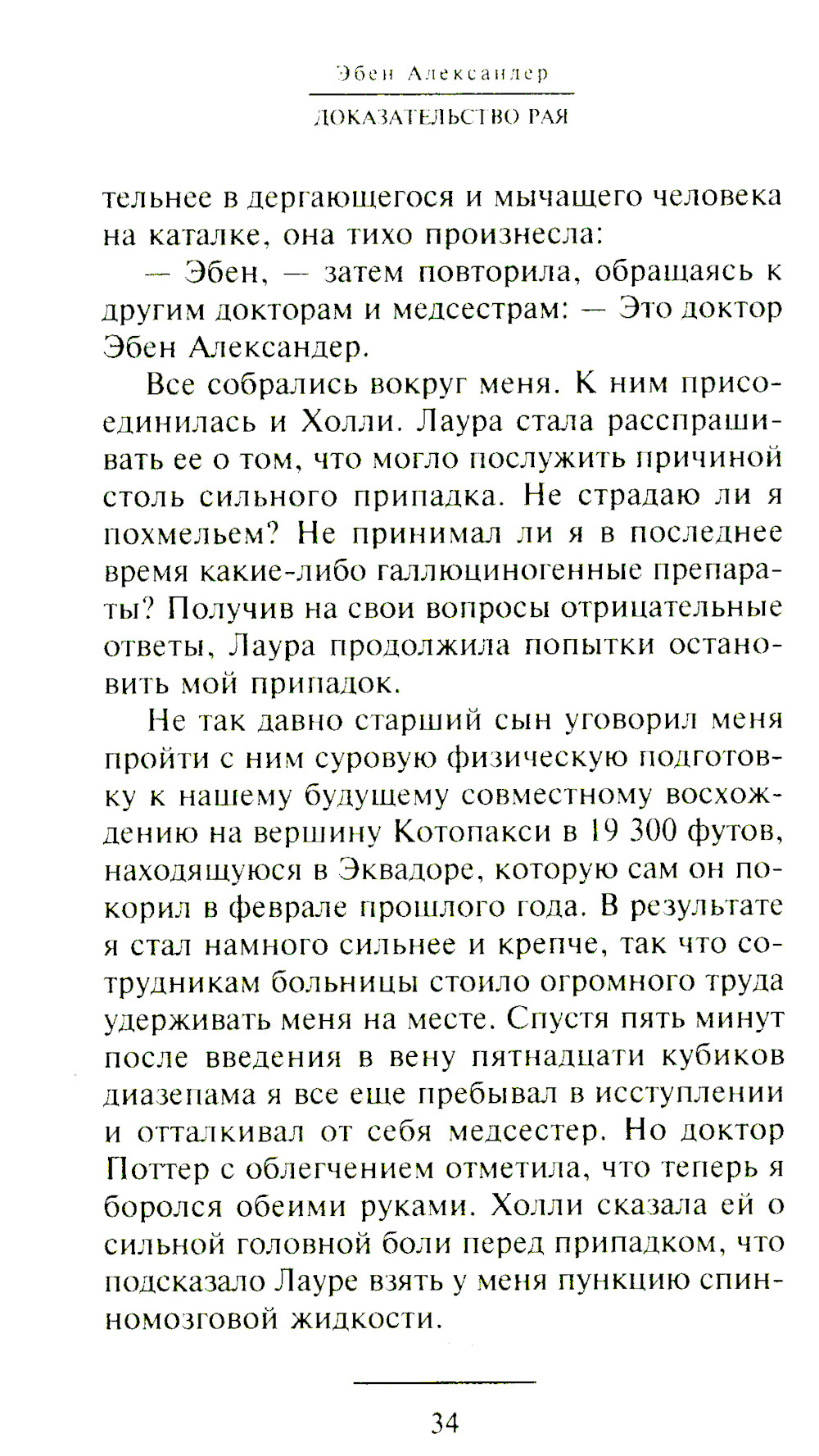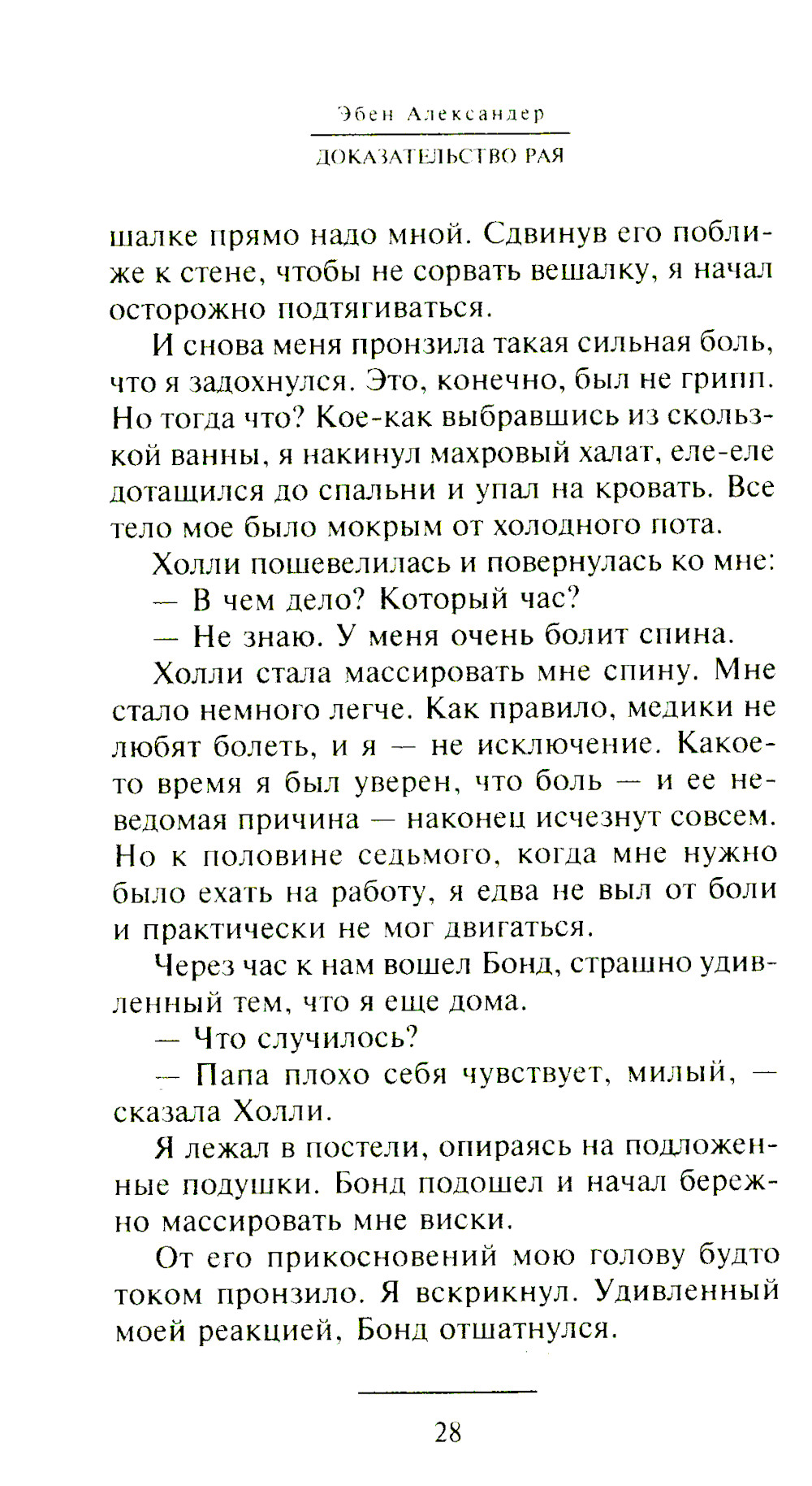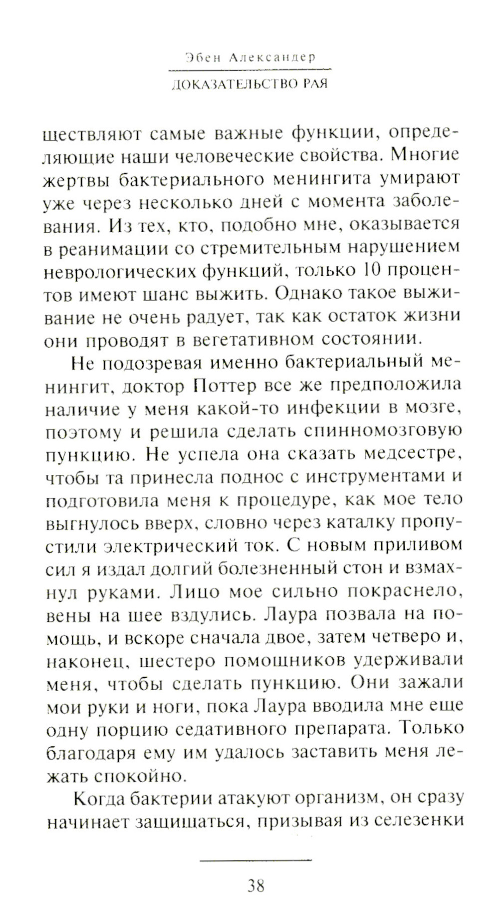 В этой книге доктор Эбен Александер, нейрохирург с 25-летним стажем, профессор, преподававший в Гарвардской медицинской школе и других крупных американских университетах, делится с читателем впечатлениями о своем путешествии на тот свет. Его случай уникален. Пораженный внезапной и необъяснимой формой бактериального менингита, он чудесным образом исцелился после семидневной комы. Высокообразованный медик с огромным практическим опытом, который прежде не только не верил в загробную жизнь, но и мысли о ней не допускал, испытал перемещение своего «я» в высшие миры и столкнулся там с такими поразительными явлениями и откровениями, что, вернувшись к земной жизни, счел своим долгом ученого и врачевателя поведать о них всему миру.