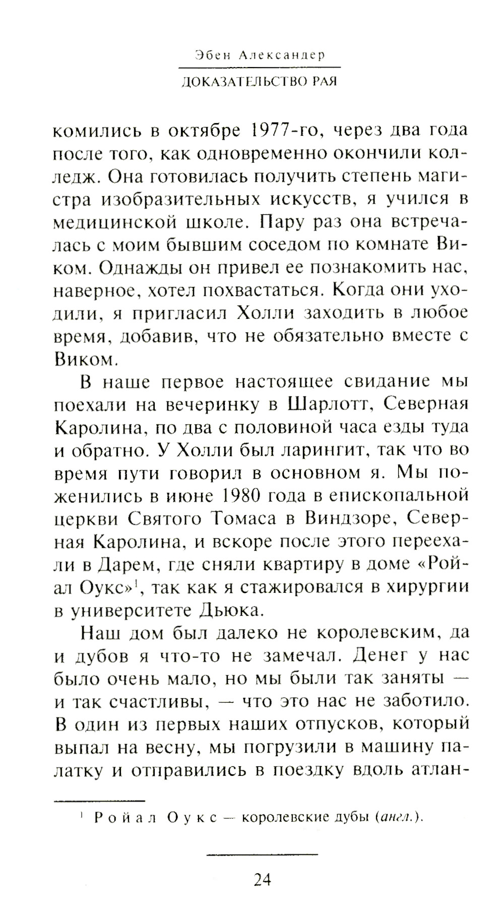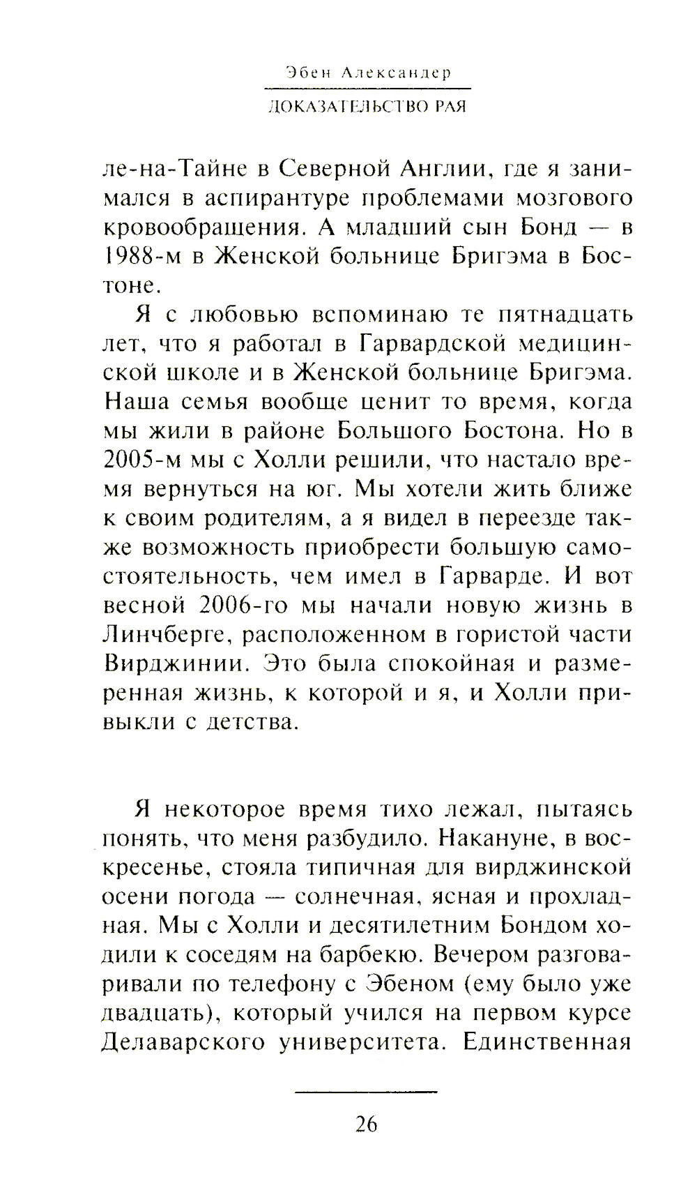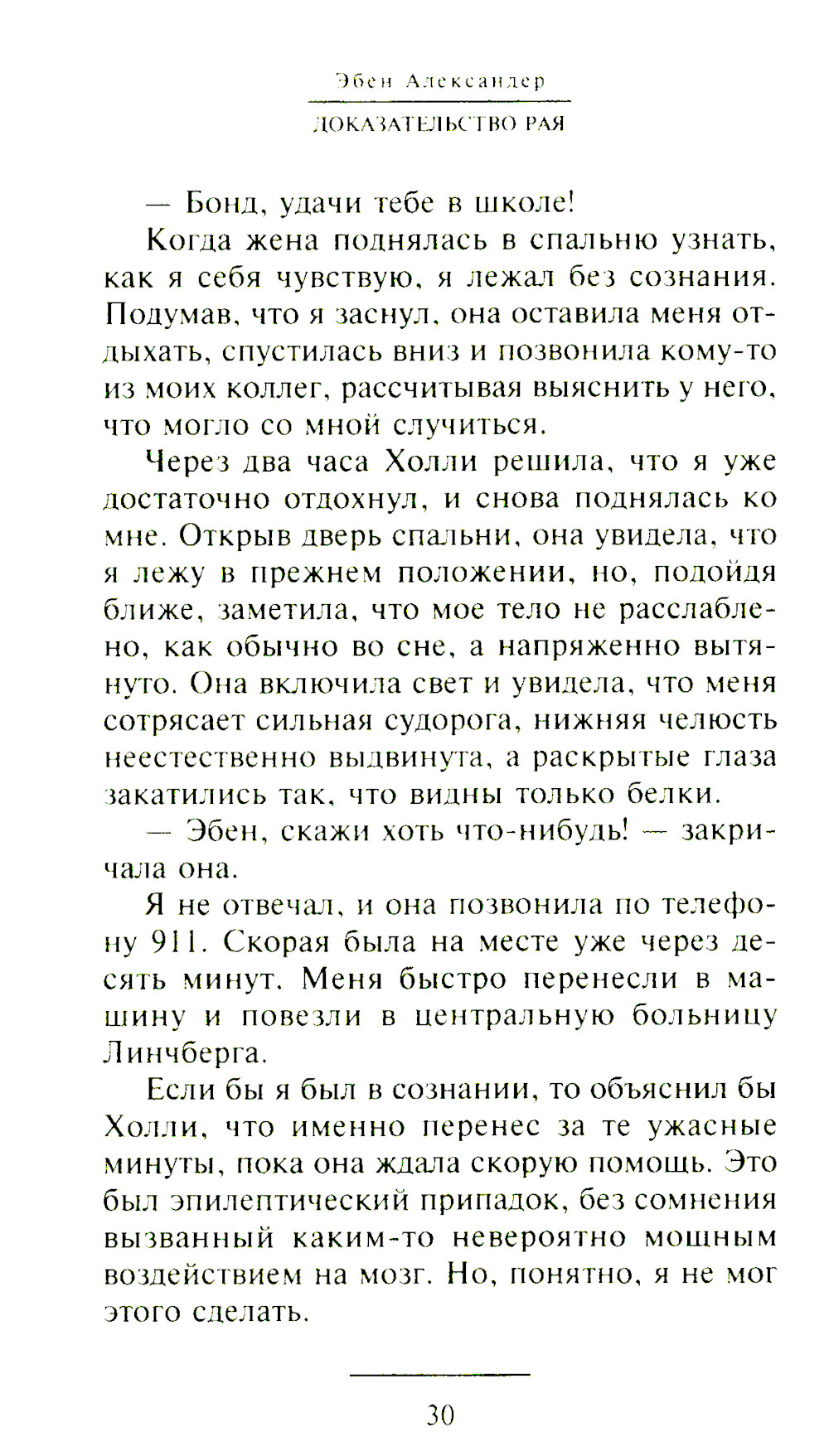В этой книге доктор Эбен Александер, нейрохирург с 25-летним стажем, профессор, преподававший в Гарвардской медицинской школе и других крупных американских университетах, делится с читателем впечатлениями о своем путешествии на тот свет. Его случай уникален. Пораженный внезапной и необъяснимой формой бактериального менингита, он чудесным образом исцелился после семидневной комы. Высокообразованный медик с огромным практическим опытом, который прежде не только не верил в загробную жизнь, но и мысли о ней не допускал, испытал перемещение своего «я» в высшие миры и столкнулся там с такими поразительными явлениями и откровениями, что, вернувшись к земной жизни, счел своим долгом ученого и врачевателя поведать о них всему миру.