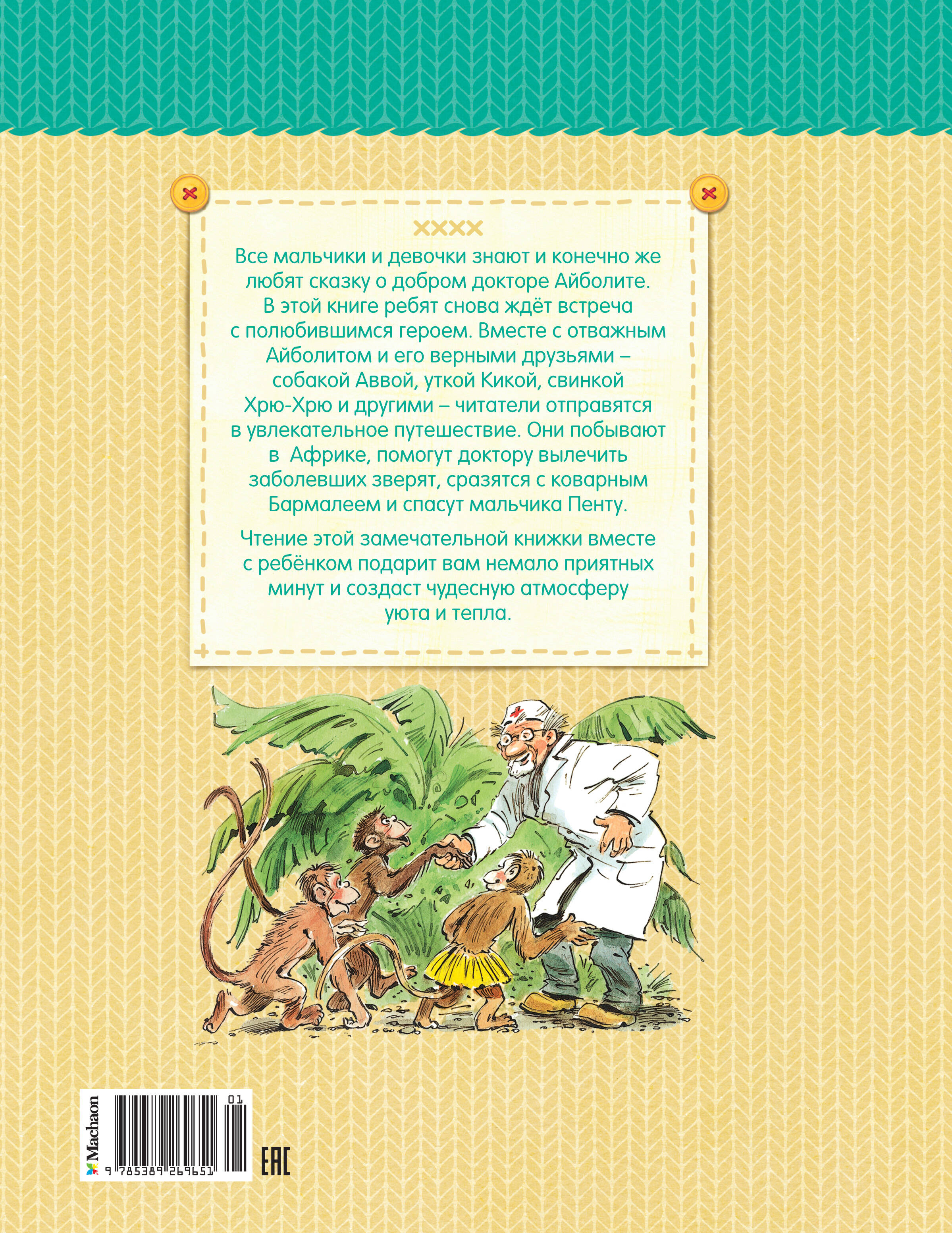Все мальчики и девочки знают и конечно же любят сказку о добром докторе Айболите. В этой книге ребят снова ждёт встреча с полюбившимся героем. Вместе с отважным Айболитом и его верными друзьями - собакой Аввой, уткой Кикой, свинкой Хрю-Хрю и другими - читатели отправятся в увлекательное путешествие. Они побывают в Африке, помогут доктору вылечить заболевших зверят, сразятся с коварным Бармалеем и спасут мальчика Пенту. Чтение этой замечательной книжки вместе с ребёнком подарит вам немало приятных минут и создаст чудесную атмосферу уюта и тепла.| Издательство | Азбука-Аттикус Издат.группа ООО |