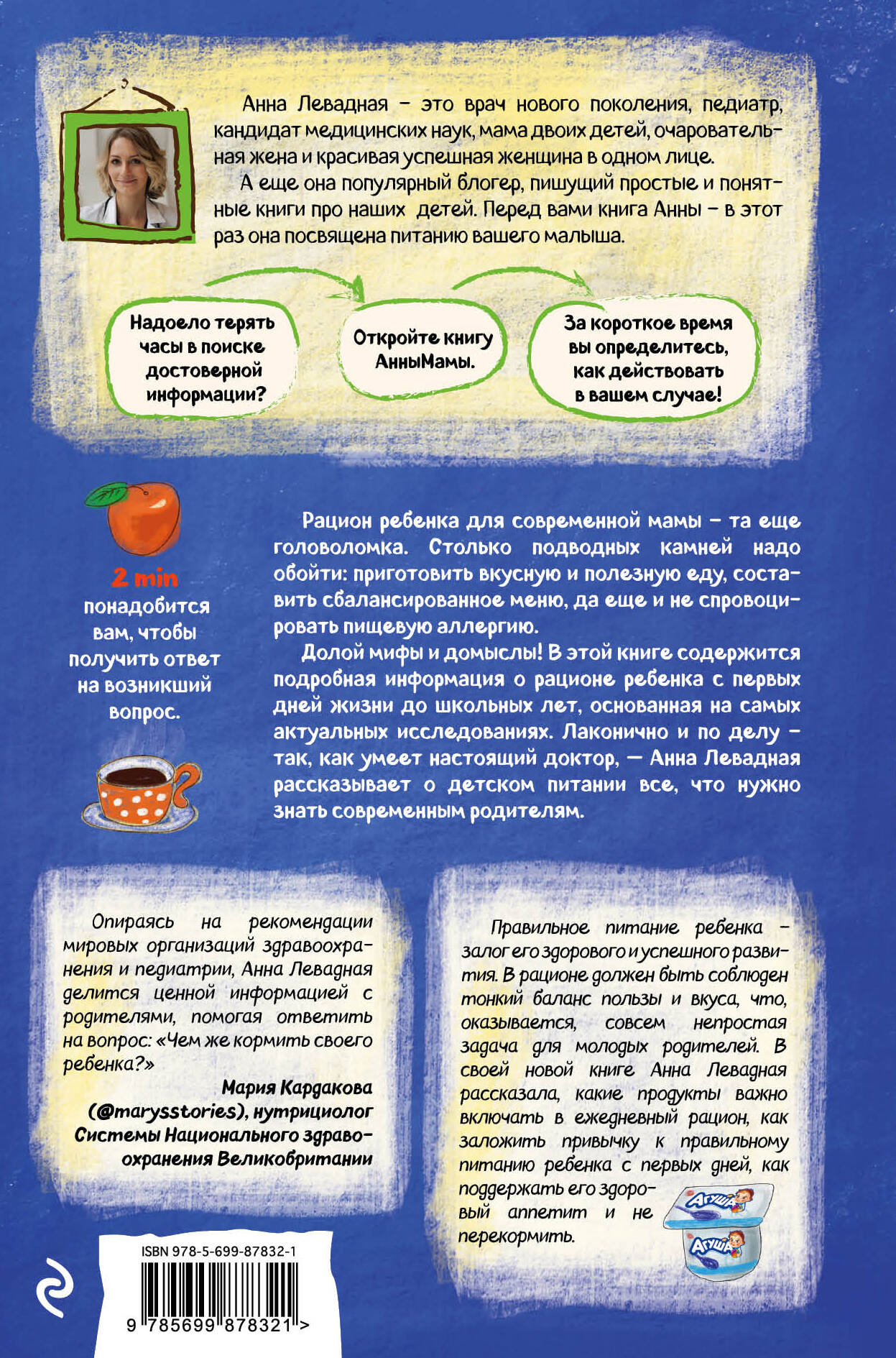 Рацион ребенка для современной мамы - та еще головоломка. Столько подводных камней надо обойти: приготовить вкусную и полезную еду, составить сбалансированное меню, да еще и не спровоцировать пищевую аллергию. В поисках ответов на свои вопросы многие отправляются к знакомым или на специальные форумы, где часто получают противоречивую информацию и теряются еще больше. Нужна ли диета кормящей матери? С чего начинать прикорм? Какие здоровые перекусы предложить школьнику? Долой мифы и домыслы! В этой книге содержится подробная информация о рационе ребенка с первых дней жизни до школьных лет, основанная на самых актуальных исследованиях. Лаконично и по делу - так, как умеет настоящий доктор, - Анна Левадная рассказывает о детском питании все, что нужно знать современным родителям. Внимание! Информация, содержащаяся в книге, не может служить заменой консультации врача. Перед совершением любых рекомендуемых действий необходимо проконсультироваться со специалистом.| Издательство | ООО "Издательство "Эксмо" |