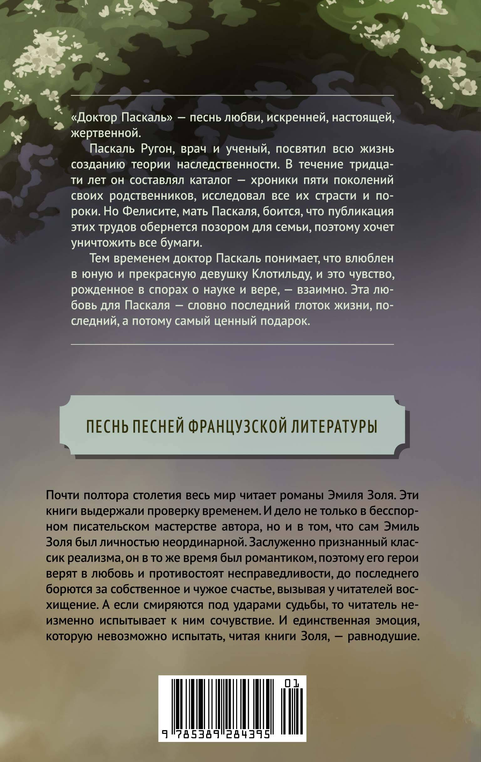 "Доктор Паскаль" - песнь любви, искренней, настоящей, жертвенной. Паскаль Ругон, врач и ученый, посвятил всю жизнь созданию теории наследственности. В течение тридцати лет он составлял каталог - хроники пяти поколений своих родственников, - исследовал все их страсти и пороки. Но Фелисете, мать Паскаля, боится, что публикация этих трудов обернется позором для семьи, поэтому хочет уничтожить все бумаги. Тем временем доктор Паскаль понимает, что влюблен в юную и прекрасную девушку Клотильду, и это чувство, рожденное в спорах о науке и вере, - взаимно. Эта любовь для Паскаля - словно последний глоток жизни, последний, а потому самый ценный подарок.| Издательство | Азбука-Аттикус Издат.группа ООО |