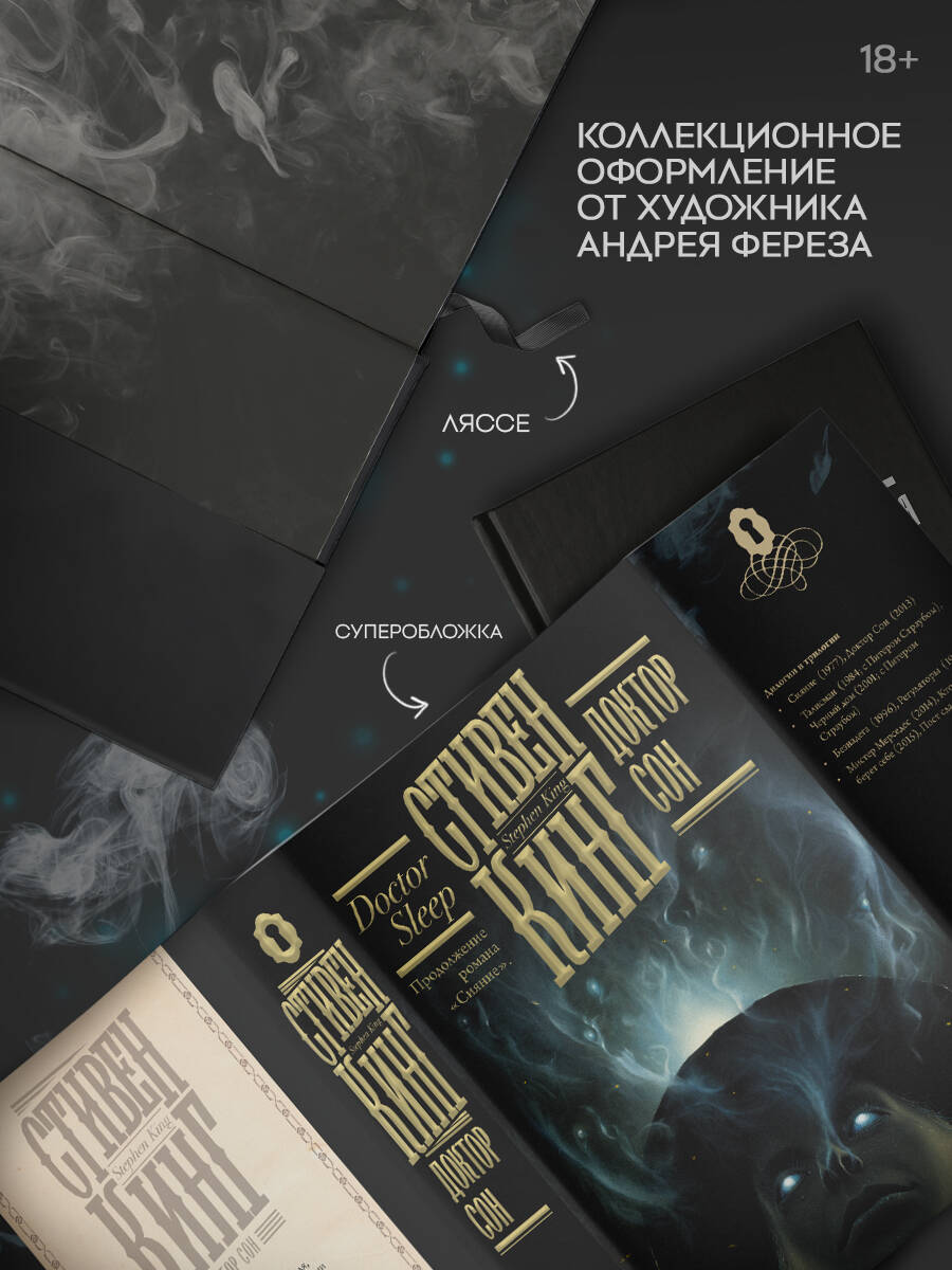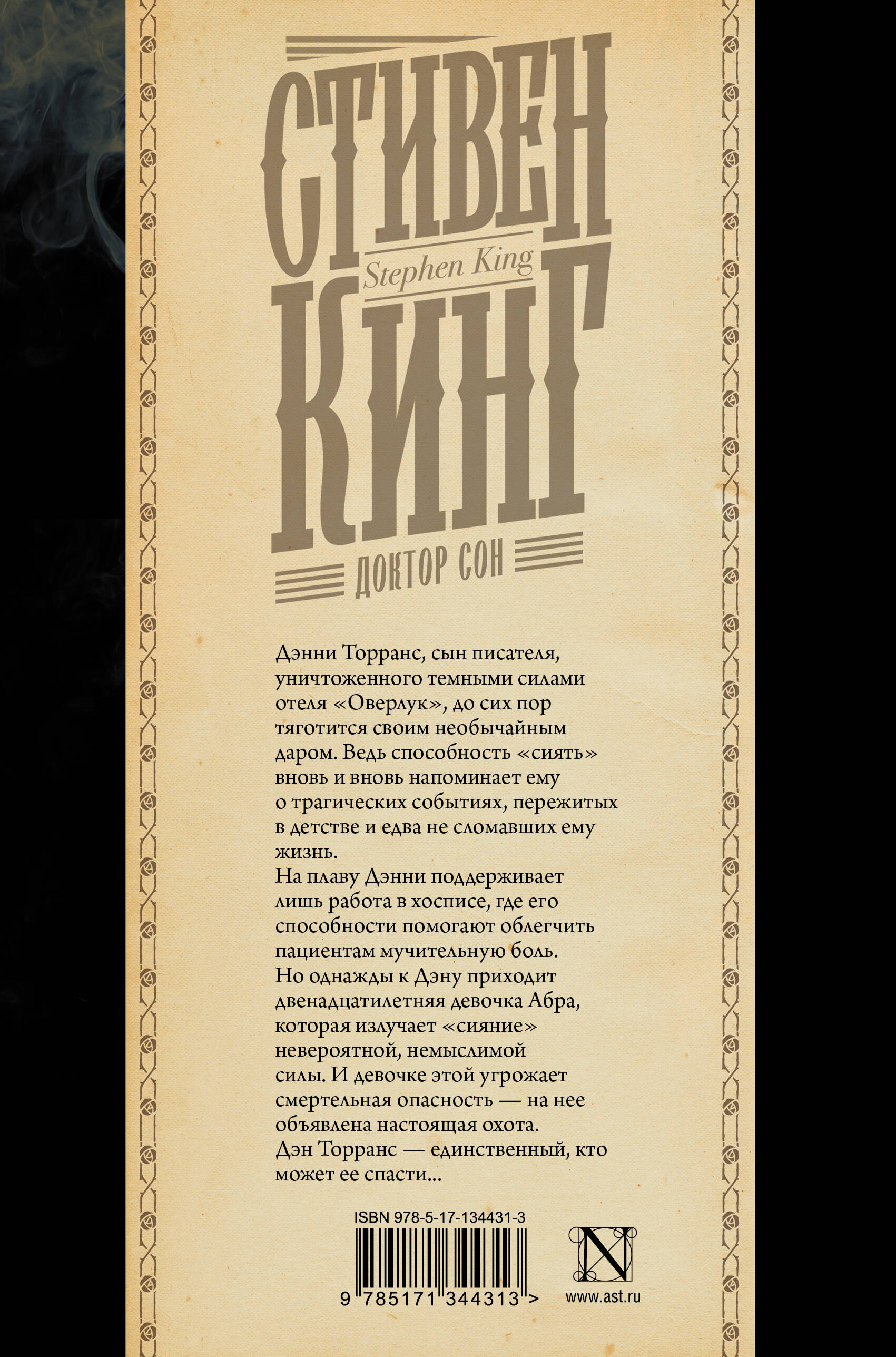 Роман «Сияние» вот уже более сорока лет остаётся одним из лучших в творчестве Стивена Кинга. Долгое время этот сюжет оставался завершённым, но тридцать лет спустя после его окончания уже изрядно заматеревший автор решил вернуться к нему и продолжить историю Дэнни Торренса. Дэнни уже давно не мальчик, а взрослый мужчина, однако он никак не может побороть детские травмы и справиться со своим уникальным даром - «Сиянием». Пользуясь своими способностями только во время работы в хосписе ради облегчения участи пациентов, Дэн ведёт тихую жизнь и всячески пытается забыть о тёмном прошлом. Но когда на его пути встречается двенадцатилетняя девочка Абра, обладающая схожим даром, его судьба резко меняется. Сможет ли Дэн спасти девочку от смертельной опасности. В 2019 году режиссёр Майк Флэнаган снял по мотивам «Доктора Сна» одноимённый фильм, в котором роль Дэна Торренса сыграл известный актёр Юэн Макгрегор. Во время работы постановщик активно сотрудничал с автором книги, чтобы лучше понять ее, учесть даже самые мелкие детали и как можно достовернее передать дух зловещих и таинственных событий романа. Данный роман издаётся в подарочной серии «Кинг: книжная полка», в которой выходят только лучшие книги автора. Каждая книга публикуется на тонированном офсете, с ляссе и суперобложкой и с уникальной обложкой Андрея Фереза.| Издательство | ИЗДАТЕЛЬСТВО "АСТ" |