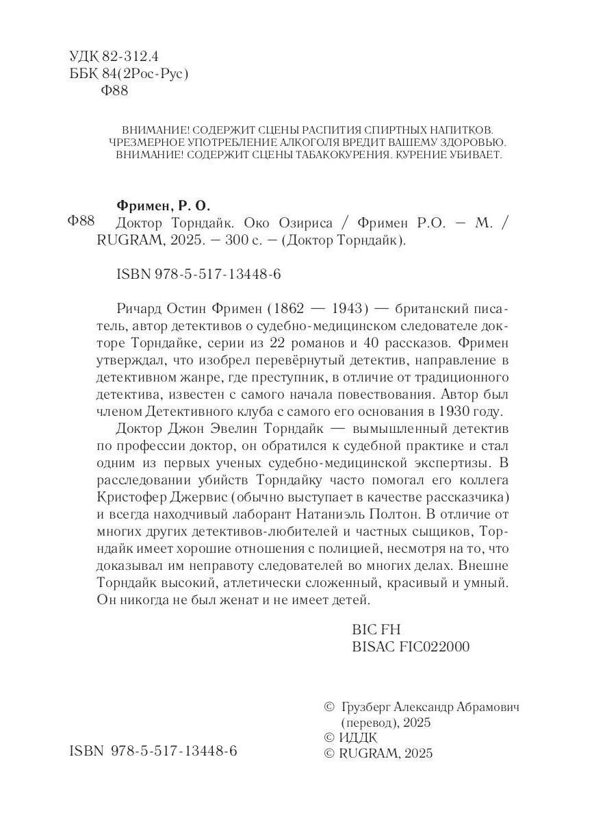 Ричард Остин Фримен (1862 - 1943) - британский писатель, автор детективов о судебно-медицинском следователе докторе Торндайке, серии из 22 романов и 40 рассказов. Фримен утверждал, что изобрел перевёрнутый детектив, направление в детективном жанре, где преступник, в отличие от традиционного детектива, известен с самого начала повествования. Автор был членом Детективного клуба с самого его основания в 1930 году. Доктор Джон Эвелин Торндайк - вымышленный детектив по профессии доктор, он обратился к судебной практике и стал одним из первых ученых судебно-медицинской экспертизы. В расследовании убийств Торндайку часто помогал его коллега Кристофер Джервис (обычно выступает в качестве рассказчика) и всегда находчивый лаборант Натаниэль Полтон. В отличие от многих других детективов-любителей и частных сыщиков, Торндайк имеет хорошие отношения с полицией, несмотря на то, что доказывал им неправоту следователей во многих делах. Внешне Торндайк высокий, атлетически сложенный, красивый и умный. Он никогда не был женат и не имеет детей.| Издательство | Т8 RUGRAM |