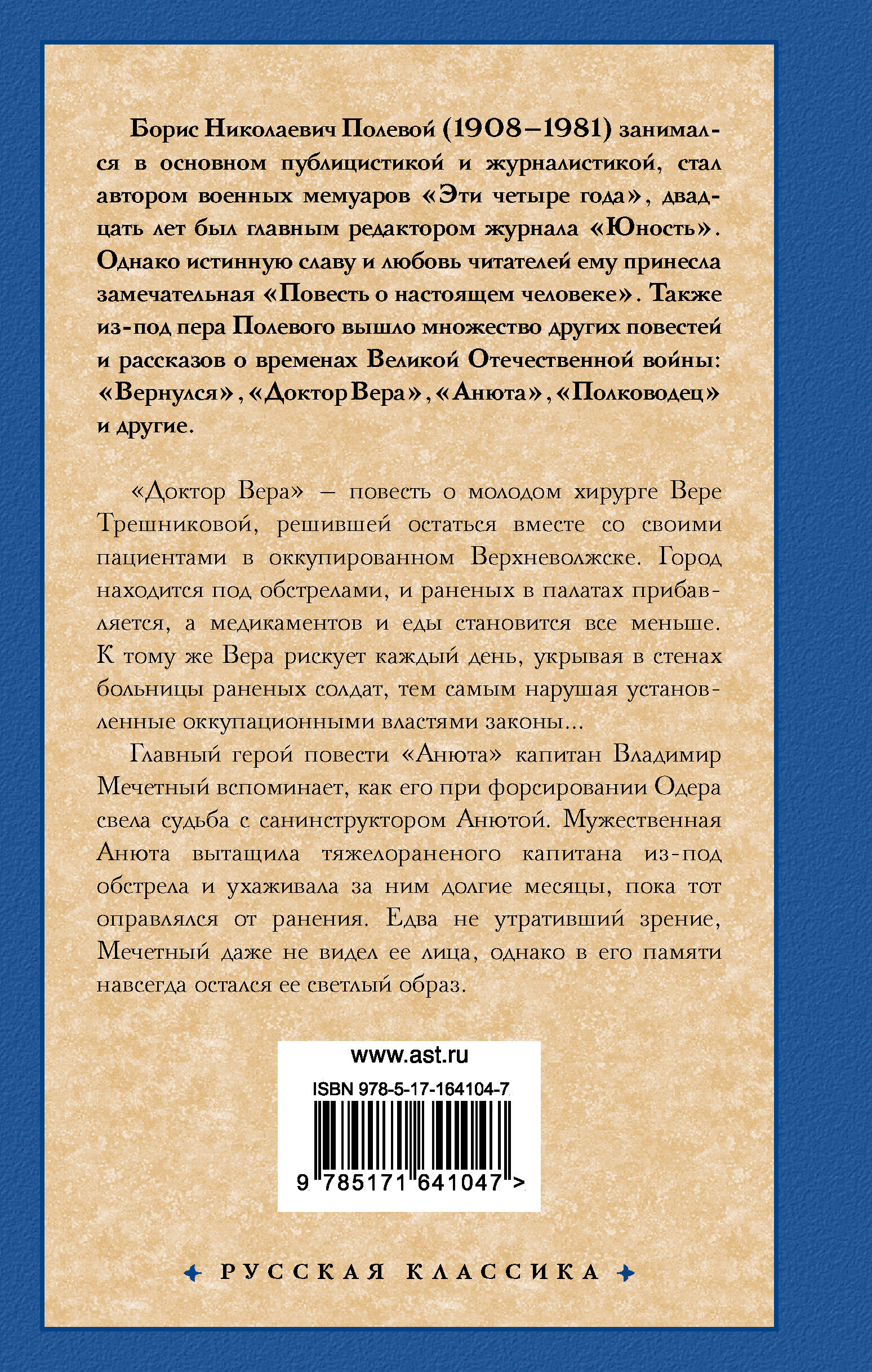 "Доктор Вера" - повесть о молодом хирурге Вере Трешниковой, решившей остаться вместе со своими пациентами в оккупированном Верхневолжске. Город находится под обстрелами, и раненых в палатах прибавляется, а медикаментов и еды становится все меньше. К тому же Вера рискует каждый день, укрывая в стенах больницы раненых солдат, тем самым нарушая установленные оккупационными властями законы… Главный герой повести "Анюта" капитан Владимир Мечетный вспоминает, как его при форсировании Одера свела судьба с санинструктором Анютой. Мужественная Анюта вытащила тяжело раненого капитана из-под обстрела и ухаживала за ним долгие месяцы, пока тот оправлялся от тяжелого ранения. Едва не утративший зрение, Мечетный даже не видел ее лица, однако в его памяти навсегда остался ее светлый образ.| Издательство | Издательство "АСТ" |
