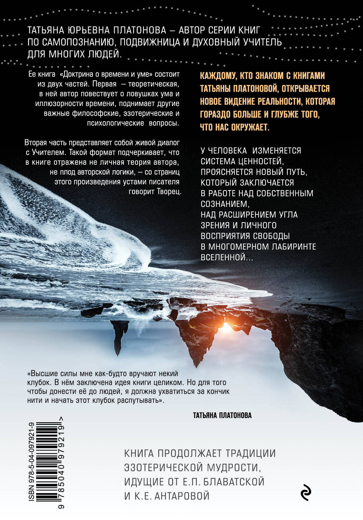 Книга Татьяны Платоновой - автора серии книг по самопознанию будет интересна как последователям традиций Е.Е.Блаватской и К.Е.Антаровой, так и тем кто только открывает свой путь духовно-мистических учений. Это философский труд, посвященный тому, как избежать ловушек ума и не попасть в капканы времени, которые мы встречаем на каждом шагу своей жизни. Каждому, кто знаком с книгами Татьяны Платоновой открывается новое видение реальности, которая гораздо больше и глубже того, что нас окружает. У человека изменяется система ценностей, проясняется новый Путь, который заключается в работе над собственным сознанием, над расширением угла зрения и личного восприятия свободы в многомерном лабиринте Вселенной... «Высшие силы мне как - будто вручают некий клубок. В нём заключена идея книги целиком. Но для того, чтобы донести её до людей, я должна ухватиться за кончик нити и начать этот клубок распутывать". Татьяна Платонова| Издательство | ООО "Издательство "Эксмо" |
