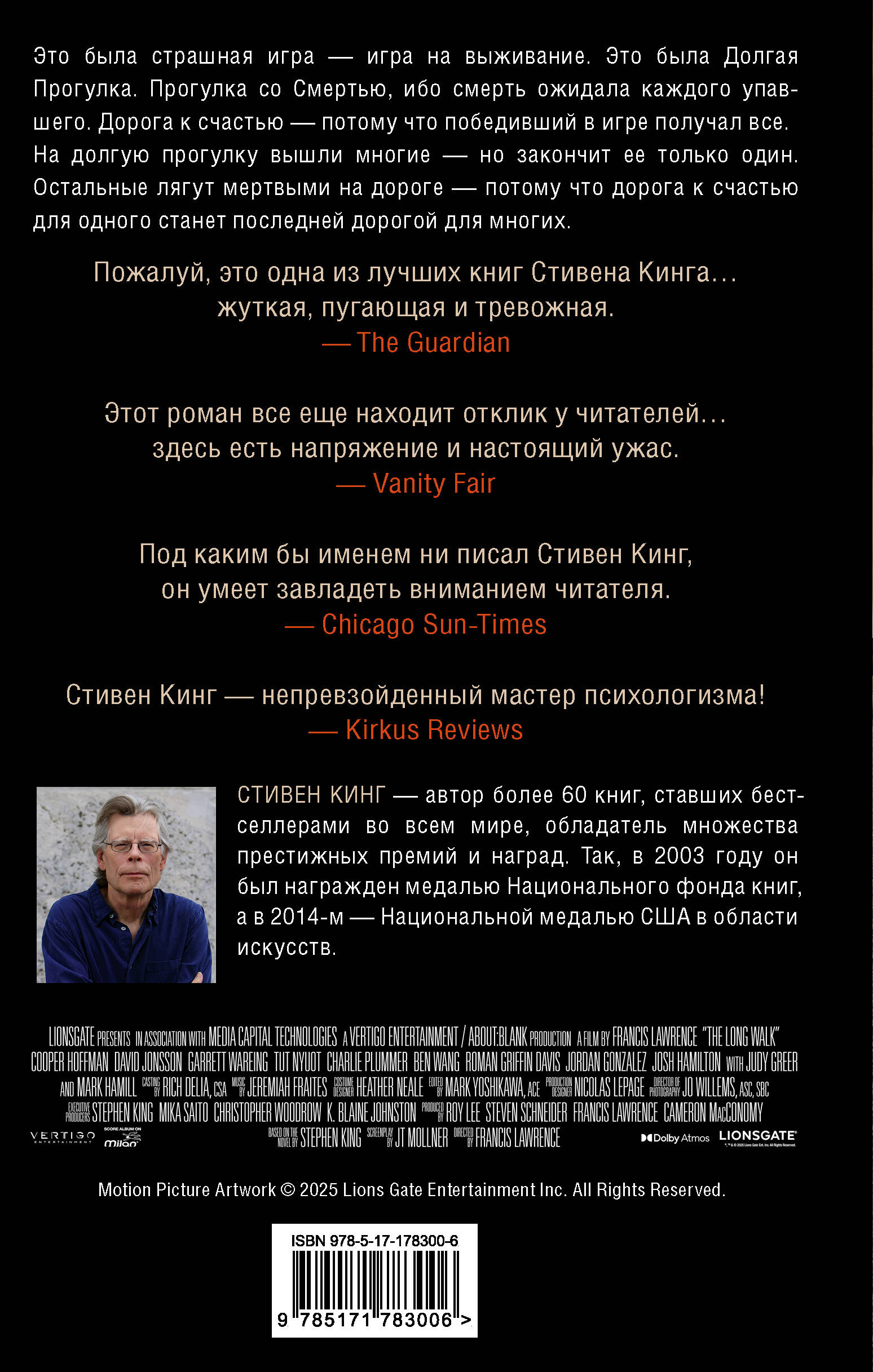 - От автора романов «Зеленая миля», «Сияние» и «Оно». - Стивен Кинг - один из самых популярных писателей современности. Он создал свыше семи десятков бестселлеров, которые переведены на 44 языка, изданы в 80 странах мира и разошлись по свету тиражом свыше 400 000 000 экземпляров. - «Долгая Прогулка» - самый первый роман Стивена Кинга, написанный еще в 1967-68 годах. Кинг более десяти лет пытался его опубликовать, но в итоге роман вышел лишь в 1979 году - под псевдонимом «Ричард Бахман». - Сам Стивен Кинг считает «Долгую Прогулку» лучшим из своих ранних произведений. - В данном издании роман публикуется в переводе Екатерины Романовой. - Читайте книгу - смотрите фильм. В сентябре 2025 года в кино выходит экранизация романа, режиссером которой выступил Фрэнсис Лоуренс («Сойка-пересмешница», «И вспыхнет пламя»), а главные роли сыграли Купер Хоффман («Лакричная пицца») и Марк Хэмилл («Звездные войны»).| Издательство | Издательство "АСТ" |
