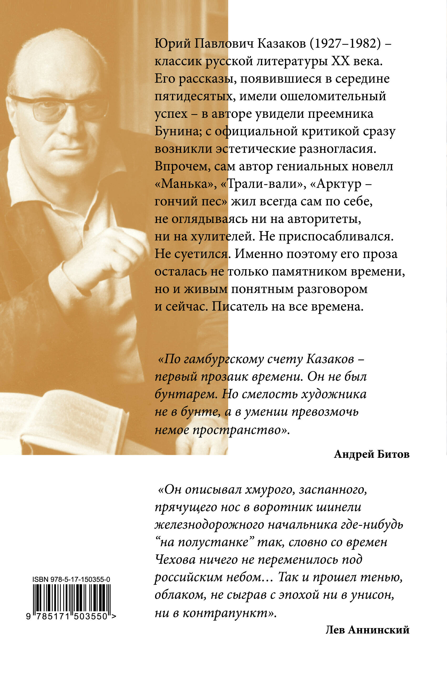Сборник гениальных рассказов русского классика, одного из лучших советских новеллистов. Самые известная короткая проза автора под одной обложкой: «Трали-вали», «Арктур - гончий пес», «Некрасивая», «Плачу и рыдаю» и другие. Лиричная, и в то же время философская, событийная проза. Тексты-размышления, подталкивающие к дальнейшей рефлексии. Юрий Казаков наследует традициям чеховской и бунинской прозы, но привносит в рассказ новые смыслы. Главный интерес автора - человек, его ценности, желания, чувства и ощущение себя в пространстве.| Издательство | ИЗДАТЕЛЬСТВО "АСТ" |