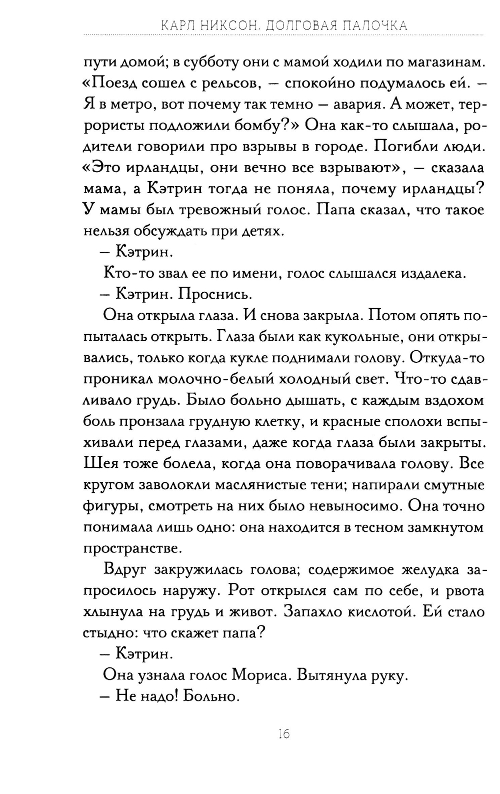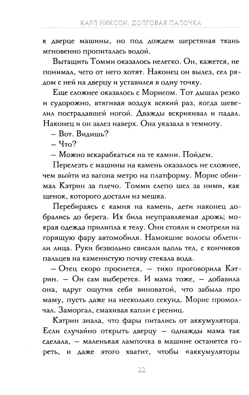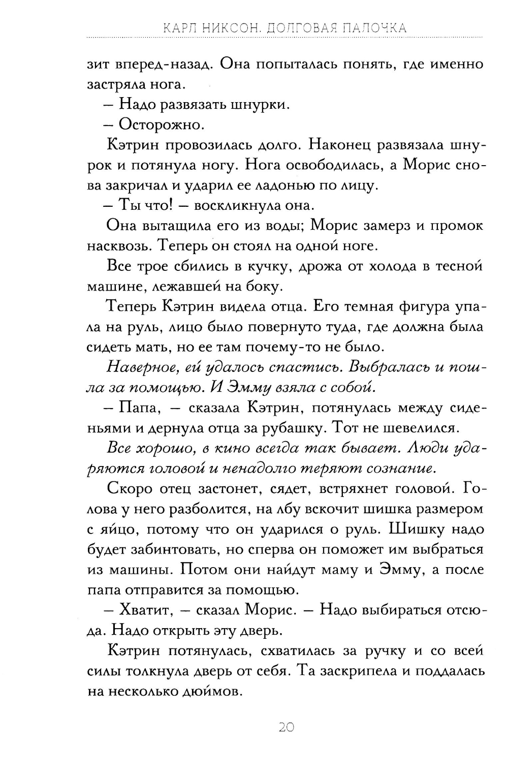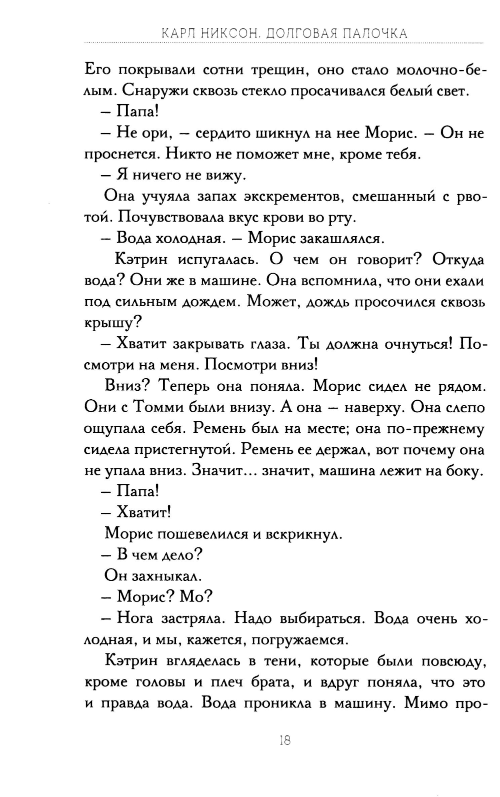 Семья Чемберленов погибла в страшной автокатастрофе. В живых не осталось никого. Так думала полиция… Тридцать лет спустя их родственница Сюзанна получает известие: в лесу обнаружили останки одного из детей, который, по данным экспертизы, прожил еще четыре года после аварии. При нем был найден загадочный брусок с засечками. Как ребенок мог выжить вдали от цивилизации, среди зарослей и скал? Удалось ли спастись кому-то еще? И зачем ему нужна была долговая палочка? Долговая палочка (истор.) - деревянный брусок с зарубками для учета долгов; брусок разламывали и отдавали по половине должнику и кредитору.| Издательство | Рипол Классик |