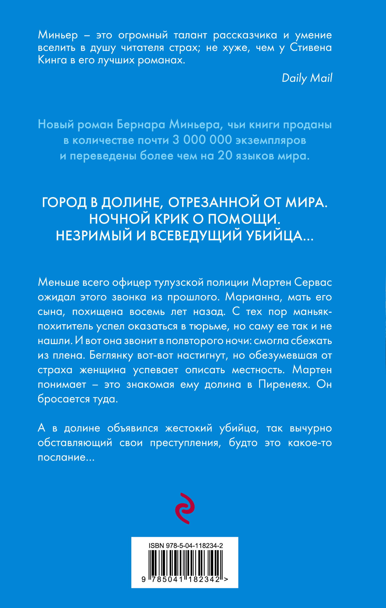 ПО РОМАНУ СНИМАЕТСЯ СЕРИАЛ NETFLIX Здесь он играет в Бога. И перст указывает на тебя. Новый роман Бернара Миньера, чьи книги проданы в количестве почти 3 миллионов экземпляров и переведены более чем на 20 языков мира. Город в долине, отрезанной от мира. Ночной крик о помощи. Незримый и всеведущий убийца… Меньше всего офицер тулузской полиции Мартен Сервас ожидал этого звонка из прошлого. Марианна, мать его сына, похищена восемь лет назад. С тех пор маньяк-похититель успел оказаться в тюрьме, но саму ее так и не нашли. И вот она звонит в полвторого ночи: смогла сбежать из плена. Беглянку вот-вот настигнут, но обезумевшая от страха женщина успевает описать местность. Мартен понимает - это знакомая ему долина в Пиренеях. Он бросается туда. А в долине объявился жестокий убийца, так вычурно обставляющий свои преступления, будто это какое-то послание… «Миньер - это огромный талант рассказчика и умение вселить в душу читателя страх; не хуже, чем у Стивена Кинга в его лучших романах». - Daily Mail «Прекрасно выверенный саспенс, отточенный стиль, запоминающиеся персонажи - и очередная "гребаная история"». - Liberation «Мастерски выстраивая свой новый сюжет, Миньер, как и раньше, размышляет о зле, касающемся каждого из нас». - Le Figaro Littéraire «Жесткий, глубокий, сложный, потрясающий роман». - Le Parisien «Оглушительное возвращение культового копа». - RTL «Романы Миньера ценятся за блестящую интригу и за ту откровенность, с которой он говорит о современном обществе». - Provence| Издательство | ООО "Издательство "Эксмо" |