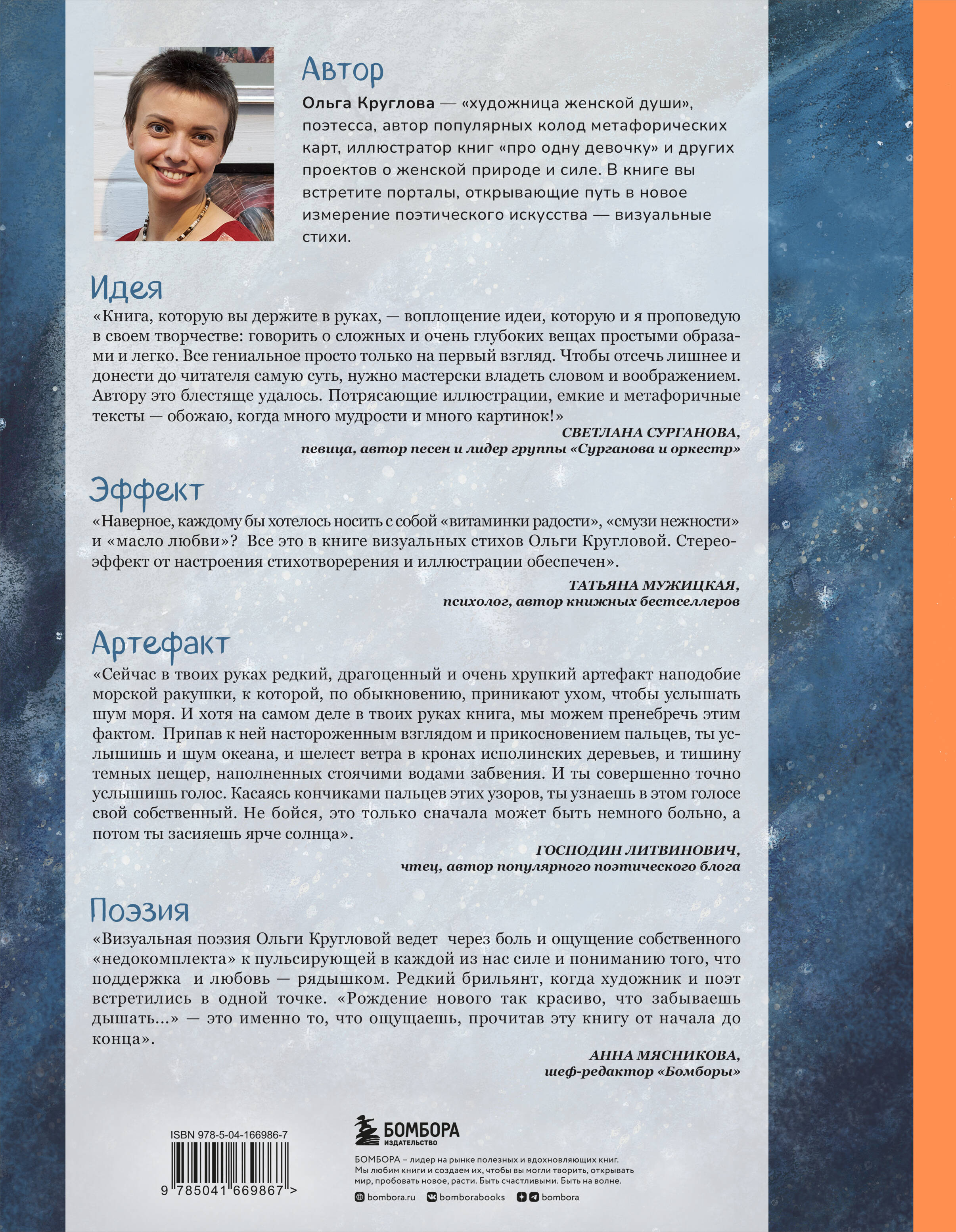 Перед вами подарочный сборник визуальных стихов и поэтических картин от Ольги Кругловой - «художницы женской души», автора популярных колод метафорических карт, иллюстратора книг «про Одну Девочку» и других проектов о женской природе и силе. Этот артбук - настоящий творческий эксперимент, в котором поэзия перетекает в визуальное искусство, а визуальное искусство - в поэзию. И все вместе создает неповторимую симфонию красок и смыслов, любви и поддержки в любой ситуации. «Долюби ее, докачай, обними, предложи ей чай...» - нежно обращается автор к своей героине, в которой каждая узнает себя. Если вы хотите нырнуть на новую глубину восприятия стихов, переходите по ссылкам, которые вы встретите на некоторых страницах, и наслаждайтесь поэзией в видеоизмерении. Книга напечатана на превосходной бумаге. И украшена серебристой фольгой. ИДЕЯ «Книга, которую вы держите в руках, - воплощение идеи, которую и я проповедую в своем творчестве: говорить о сложных и очень глубоких вещах простыми образами и легко. Все гениальное просто только на первый взгляд. Чтобы отсечь лишнее и донести до читателя самую суть, нужно мастерски владеть словом и воображением. Автору это блестяще удалось. Потрясающие иллюстрации, ёмкие и метафоричные тексты - обожаю, когда много мудрости и много картинок!» - Светлана Сурганова, певица, автор песен и лидер группы «Сурганова и оркестр» АРТЕФАКТ «Сейчас в твоих руках редкий, драгоценный и очень хрупкий артефакт наподобие морской ракушки, к которой по обыкновению приникают ухом, чтобы услышать шум моря. И хотя на самом деле в твоих руках книга, мы можем пренебречь этим фактом. Только сейчас и с этой книгой. Припав к ней настороженным взглядом и прикосновением пальцев, ты услышишь и шум океана, и шелест ветра в кронах исполинских деревьев, и тишину тёмных пещер, наполненных стоячими водами забвения. И ты совершенно точно услышишь голос. Касаясь кончиками пальцев этих узоров, ты узнаешь в этом голосе свой собственный. Было бы слишком просто назвать эту книгу наставником или проводником, но это гораздо больше, чем просто наставничество. Настолько больше, насколько проще, ведь это твоя встреча с собой. Не бойся, это только сначала может быть немного больно, а потом ты засияешь ярче солнца. Смотри, как это красиво! Как много красок со страниц прямиком в твоё сердце!» - Господин Литвинович, чтец, автор популярного поэтического блога ПОЭЗИЯ «Визуальная поэзия Ольги Кругловой ведет через боль и ощущение собственного "недокомплекта" к пульсирующей в каждой из нас силе и пониманию того, что поддержка и любовь - рядышком. Только протяни руку и прислушайся к образам, которые автор щедрой рукой рассыпала для тебя по страницам своей книги. Редкий брильянт, когда художник и поэт встретились в одной точке. "Рождение нового так красиво, что забываешь дышать..." - это именно то, что ощущаешь, прочитав эту книгу от начала до конца». - Анна Мясникова, шеф-редактор «Бомборы»| Издательство | ООО "Издательство "Эксмо" |