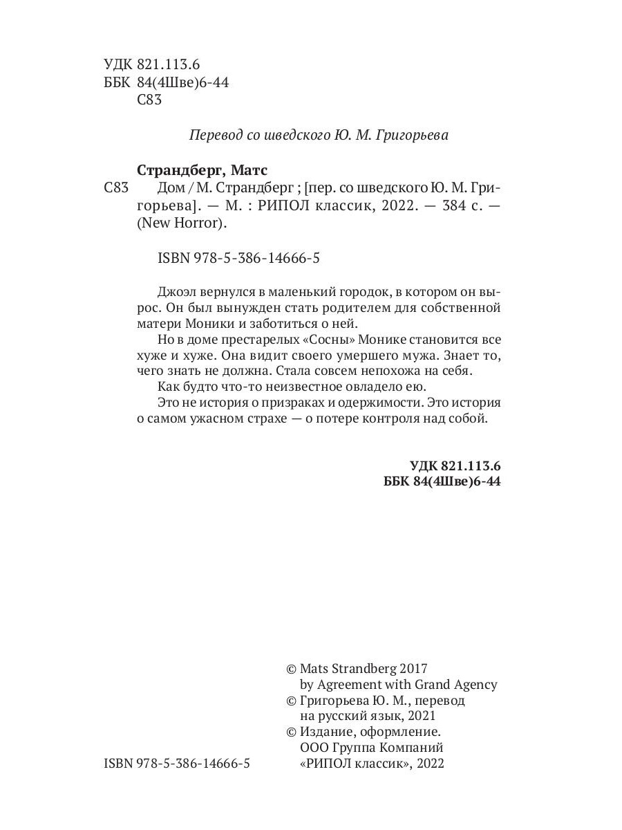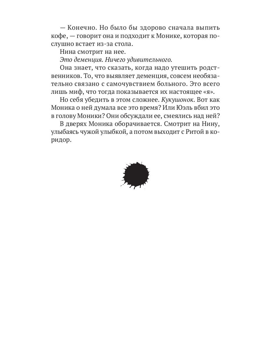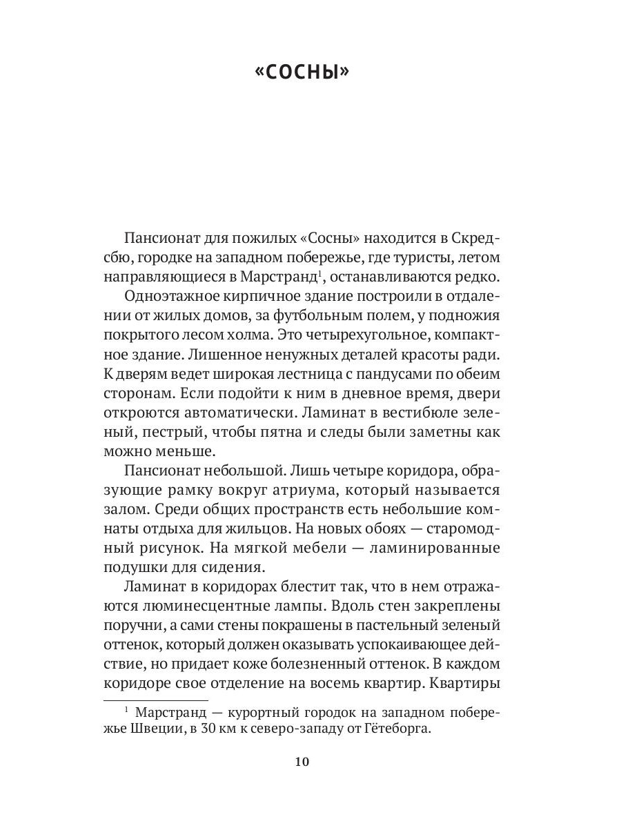 Джоэл вернулся в маленький городок, в котором он вырос. Он был вынужден стать родителем для собственной матери Моники и заботиться о ней. Но в доме престарелых «Сосны» Монике становится все хуже и хуже. Она видит своего умершего мужа. Знает то, чего знать не должна. Стала совсем непохожа на себя. Как будто что-то неизвестное овладело ею. Это не история о призраках и одержимости. Это история о самом ужасном страхе - о потере контроля над собой.| Издательство | Рипол Классик |