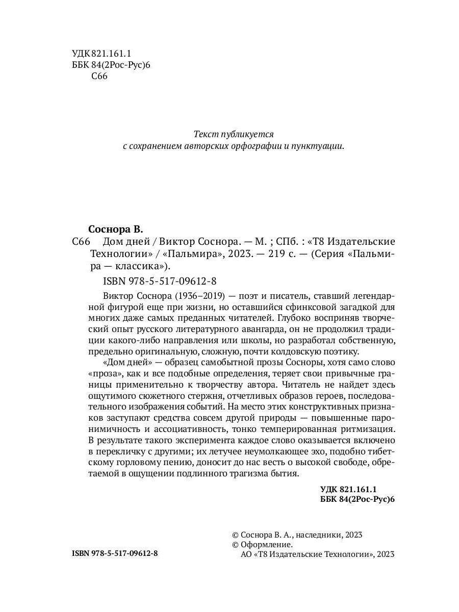 "Дом дней" - книга, которую следовало бы отнести к прозаическому наследию Сосноры, назвав ее автобиографией, однако ни одно из принятых определений такого рода не описывает сложной и невероятно оригинальной поэтики, разработанной автором. Видимая фрагментарность, приемы абсурда и зауми, указывающие на творческое переосмысление русского литературного авангарда, оказываются лишь внешними, легко уловимыми ее признаками. В действительности же, создавая свой художественный космос, Соснора идет дальше и глубже - к самым истокам языка, где звук, образ и символ еще не разъединены и, говоря о вещах, одновременно с тем сообщают обо всем мироздании. Это миф, творимый на наших глазах, и вместе с тем спасение внутреннего опыта, предельно индивидуального и оттого - общечеловеческого.| Издательство | Т8 RUGRAM |