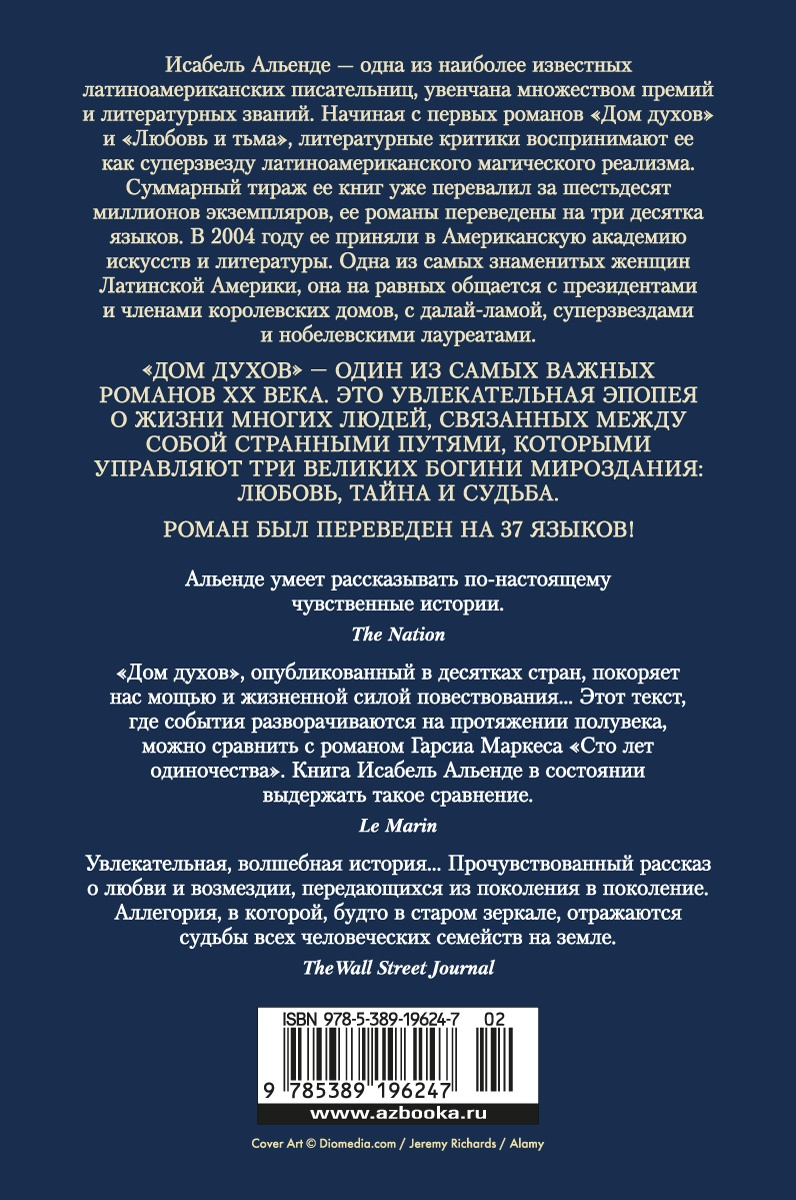 Исабель Альенде - одна из наиболее известных латиноамериканских писательниц, увенчана множеством премий и литературных званий. Начиная с первых романов «Дом духов» и «Любовь и тьма» литературные критики воспринимают ее как суперзвезду латиноамериканского магического реализма. Суммарный тираж ее книг уже перевалил за шестьдесят миллионов экземпляров, ее романы переведены на три десятка языков. В 2004 году ее приняли в Американскую академию искусств и литературы. Одна из самых знаменитых женщин Латинской Америки, она на равных общается с президентами и членами королевских домов, с далай-ламой, суперзвездами и нобелевскими лауреатами. «Дом духов» - это волнующее эпическое повествование об истории семьи Труэба. Здесь все реально и все волшебно, начиная с девушки с зелеными волосами, наделенной даром ясновидения: реальный пласт с уютом семейного дома, жизнью многострадальной страны, политическими бурями и тяжким трудом, стихией бунта, доверием, предательством, расстрелами, пытками, судьбой Поэта, за которой просматривается история певца Виктора Хары, и отражение этого зримого мира в волшебном зеркале предчувствий, роковых предсказаний, безумной страсти, которой не в силах помешать даже смерть.| Издательство | Иностранка |