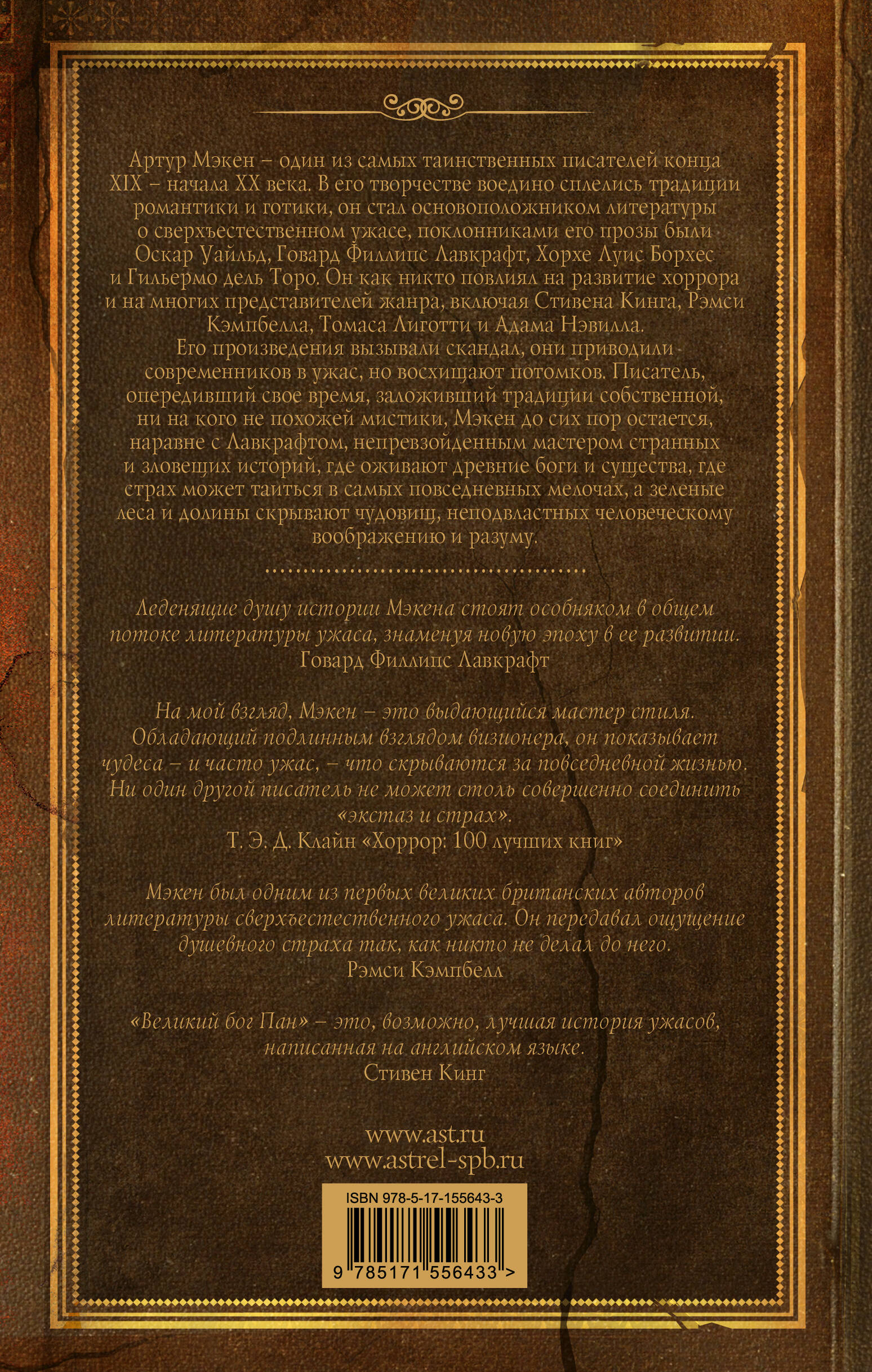 Артур Мэкен - один из самых таинственных писателей конца XIX - начала XX века. В его творчестве воедино сплелись традиции романтики и готики, он стал основоположником литературы о сверхъестественном ужасе, поклонниками его творчества были Оскар Уайльд, Говард Филлипс Лавкрафт, Хорхе Луис Борхес и Гильермо дель Торо. Он как никто повлиял на развитие хоррора и на многих представителей жанра, включая Стивена Кинга, Рэмси Кэмпбелла, Томаса Лиготти и Адама Нэвилла. Его произведения вызывали скандал, они приводили современников в ужас, но восхищают потомков. Писатель, опередивший свое время, заложивший традиции собственной, ни на кого не похожей мистики, Мэкен до сих пор остается, наравне с Лавкрафтом, непревзойденным мастером странных и зловещих историй, где оживают древние боги и существа, где страх может таиться в самых повседневных мелочах, а зеленые леса и долины скрывают чудовищ, неподвластных человеческому воображению и разуму.| Издательство | Издательство "АСТ" |