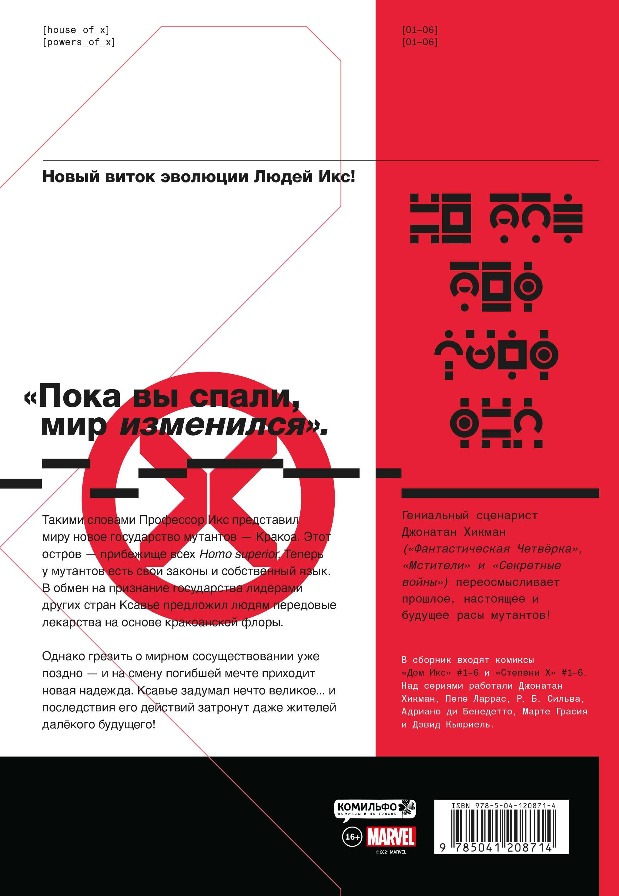 Новый виток эволюции Людей Икс! «Пока вы спали, мир изменился». Такими словами Профессор Икс представил миру новое государство мутантов - Кракоа. Этот остров - прибежище всех Homo Superior. Теперь у мутантов есть свои законы и собственный язык. В обмен на признание государства лидерами других стран Ксавье предложил людям новейшие лекарства на основе кракоанской флоры. Однако грезить о мирном сосуществовании уже поздно - и на смену погибшей мечте приходит новая надежда. Ксавье задумал нечто великое... и последствия его действий затронут даже жителей далёкого будущего! Гениальный сценарист Джонатан Хикман («Фантастическая Четвёрка», «Мстители» и «Секретные войны») переосмысливает прошлое, настоящее и будущее расы мутантов! Новая эра в мире Людей Икс - настоящее событие для всего комикс-сообщества планеты! Автор комикса Джонатан Хикман, известный своими революционными переосмыслениями известных серий («Мстители», «Фантастическая Четвёрка») и детальной проработкой сюжета. Лучший вариант для знакомства нового читателя с франшизой «Люди Икс»! Первое за долгие годы внушительное издание комиксов про Людей Икс - издание, которого заслуживает эта нашумевшая история! В сборник входят комиксы «Дом Икс» #1-6 и «Степени Х» #1-6. Над сериями работали Джонатан Хикман, Пепе Ларрас, Р. Б. Сильва, Адриано ди Бенедетто, Марте Грасия и Дэвид Кьюриель.