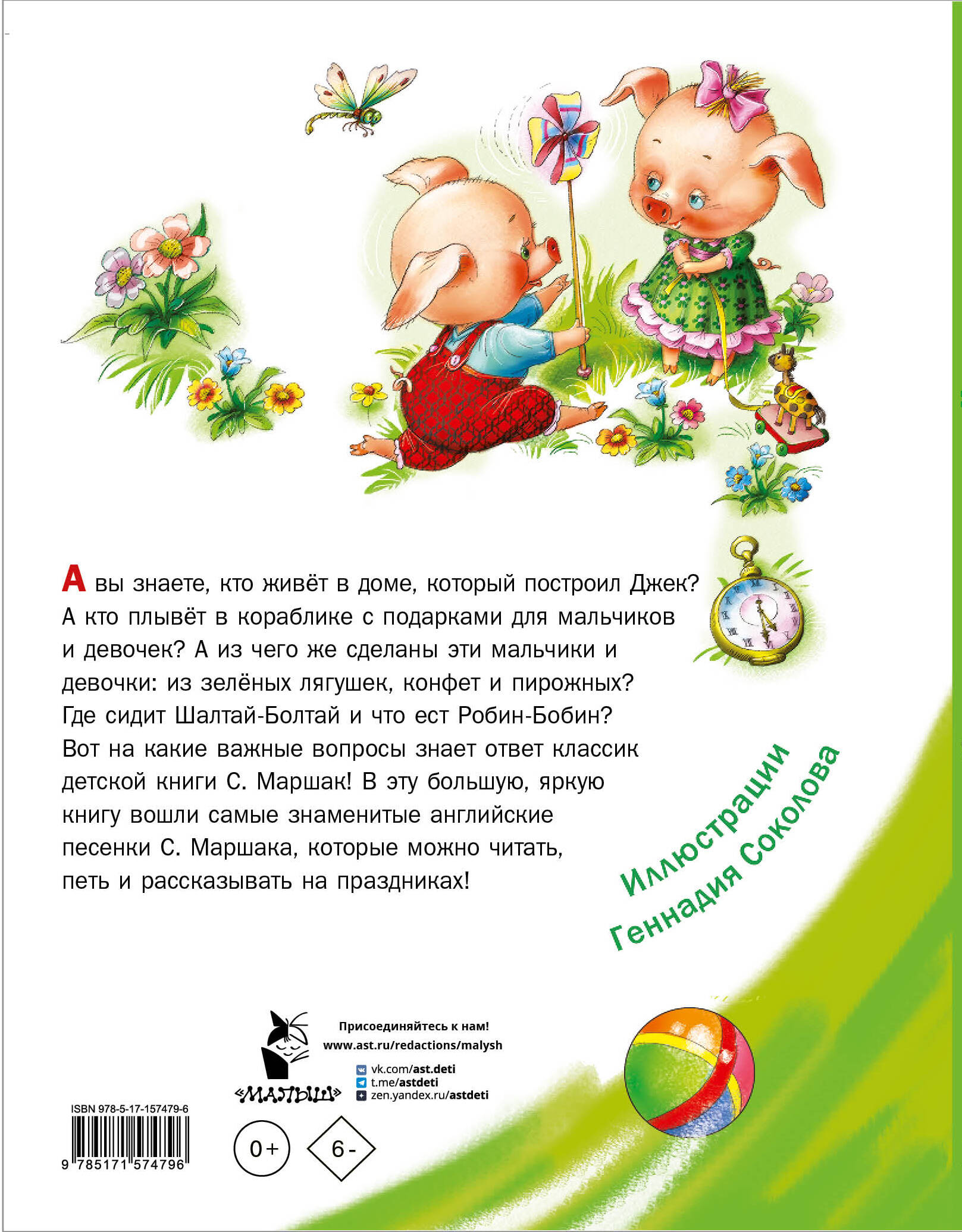 А вы знаете, кто живёт в доме, который построил Джек? А кто плывёт в кораблике с подарками для мальчиков и девочек? А из чего же сделаны эти мальчики и девочки: из зелёных лягушек, конфет и пирожных? Где сидит Шалтай-Болтай и что ест Робин-Бобин? Вот на какие важные вопросы знает ответ классик детской книги С. Маршак! В эту большую, яркую книгу вошли самые знаменитые английские песенки С. Маршака, которые можно читать, петь и рассказывать на праздниках!| Издательство | ИЗДАТЕЛЬСТВО "АСТ" |